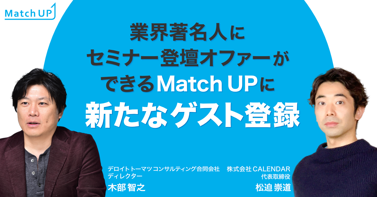 業界専門家にセミナー/イベント登壇のオファーができる「Match UP」 デロイト トーマツ コンサルティング合同会社の木部 智之氏、株式会社CALENDARの松迫 崇道氏などが新たにゲスト登録!