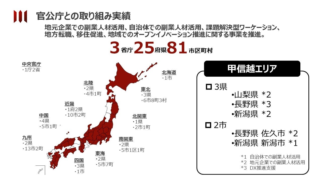 2019年には関西支社、今年4月には九州支社・東北支社を開設し、地方副業・転職やオープンイノベーション、実践型ワーケーション、DX支援等に関わる地方創生事業に取り組んできました。現在は、3省25府県81市区町村や全国113の地域金融機関と連携しながら、地域企業での外部人材活用を推進しています。先般、甲信越エリアの自治体事業受託やクライアントからの引き合いが増えた事から、この度、甲信越支社を新設することといたしました。
