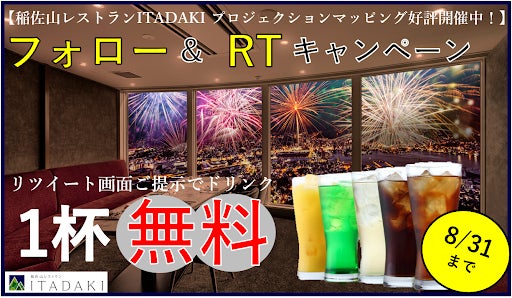 稲佐山公園公式Twitter(X)をフォローし、発信する投稿をリツイート、もしくは公式Instagramをフォローいただいた方に、稲佐山レストランITADAKIのドリンクを1杯無料でプレゼントいたします!(キャンペーン期間:8/31まで)