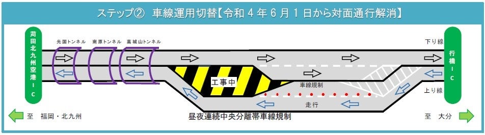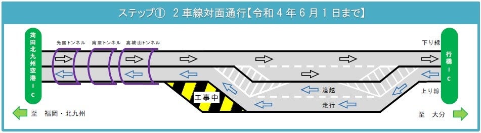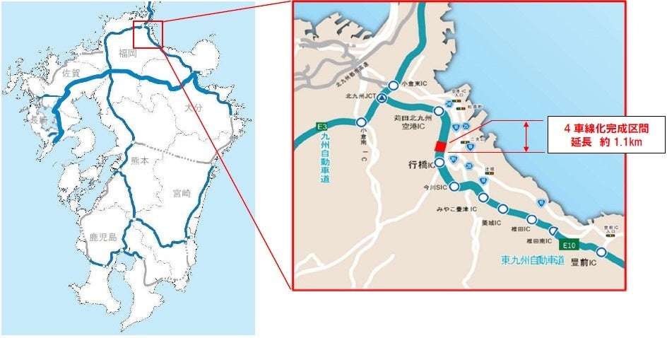 道 苅田北九州空港インターチェンジ(IC)~行橋IC 間(延長:約8.6km)の一部4車線化工事(延長:約1.1 ㎞)が、