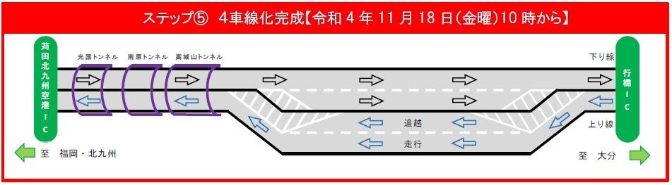 E10 東九州自動車道 苅田(かんだ)北九州空港IC~行橋(ゆくはし)IC 間の一部の4 車線化工事が令和4 年11 月18 日(金曜)に完成します