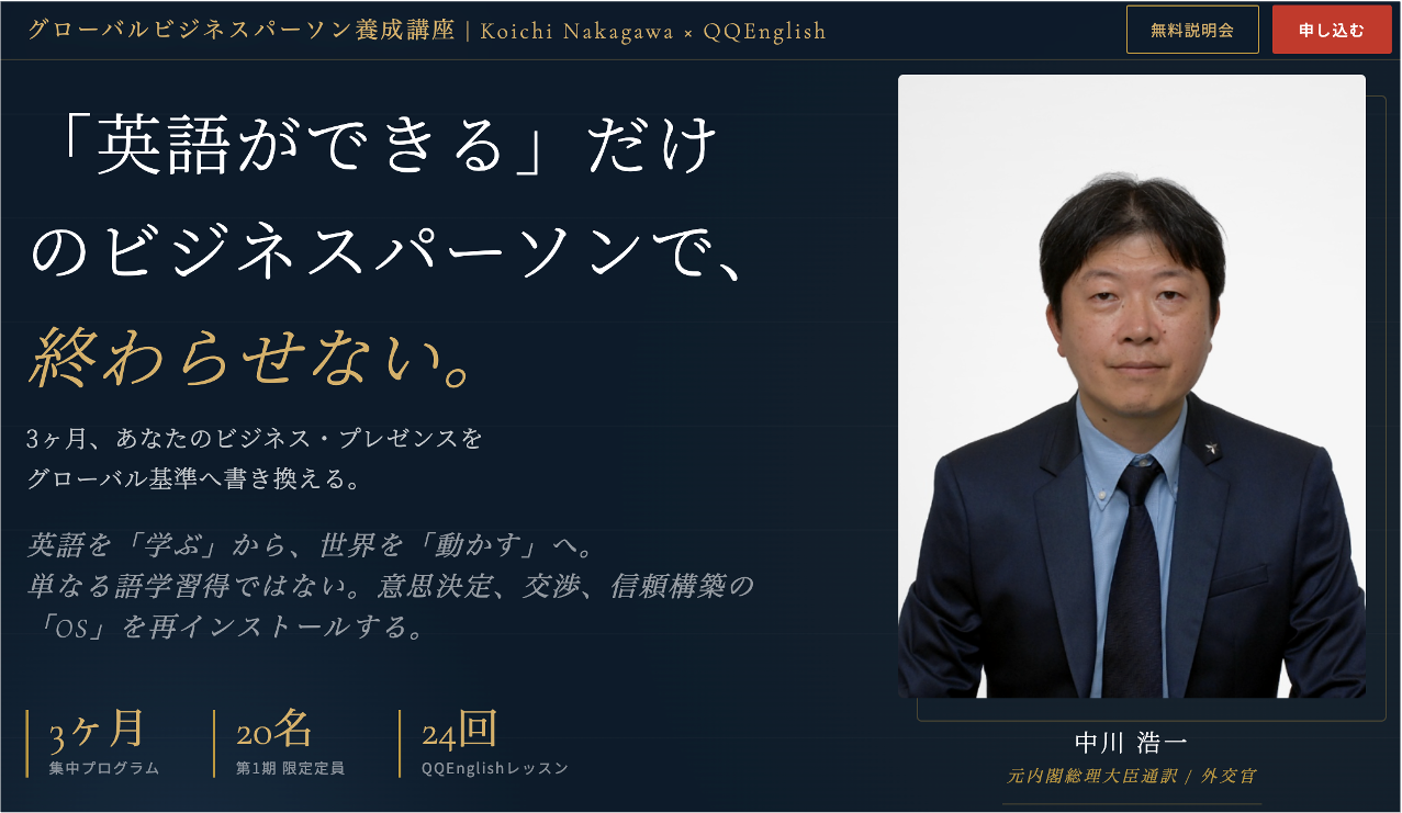 株式会社QQ English(本社:東京都新宿区、代表取締役:藤岡頼光)は、元内閣総理大臣・天皇通訳を務めた外交官・中川浩一氏とのコラボレーションによる「グローバルビジネスパーソン養成講座」を開講します。2026年5月14日(木)より全6回、定員20名の第1期プログラムとして始動します。