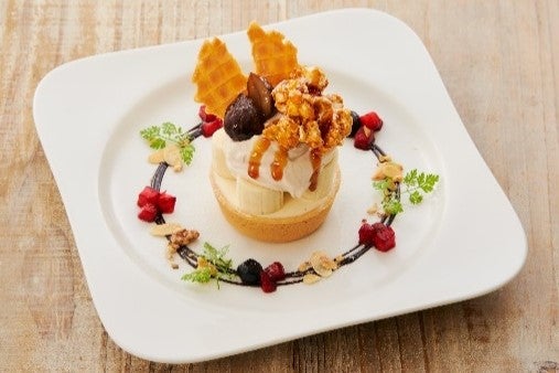 オリジナルのカスタードクリームと渋皮栗、キャラメルソースの組み合わせがマッチしたタルト。ワッフルチップやキャラメルポップコーンを口に運ぶたびに異なる食感もお愉しみいただけます。