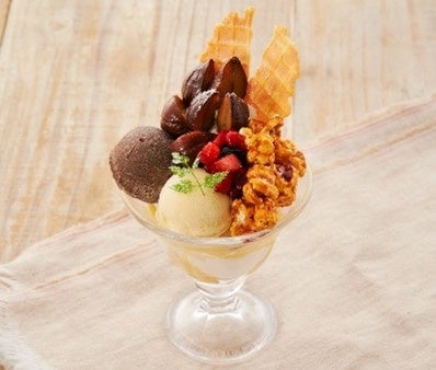 渋皮栗とキャラメルソースが重なり合うパフェは、ドライフルーツやマロンホイップ、トッピングにベルギーチョコアイスやミックスベリーなど、盛りだくさんで食べ応えのあるスイーツです。