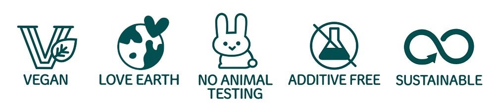 動物性原料フリー、サルフェートフリー(ラウレス硫酸Naなど)、パラベンフリー、アルコールフリー、合成色素フリー、鉱物油フリー。
