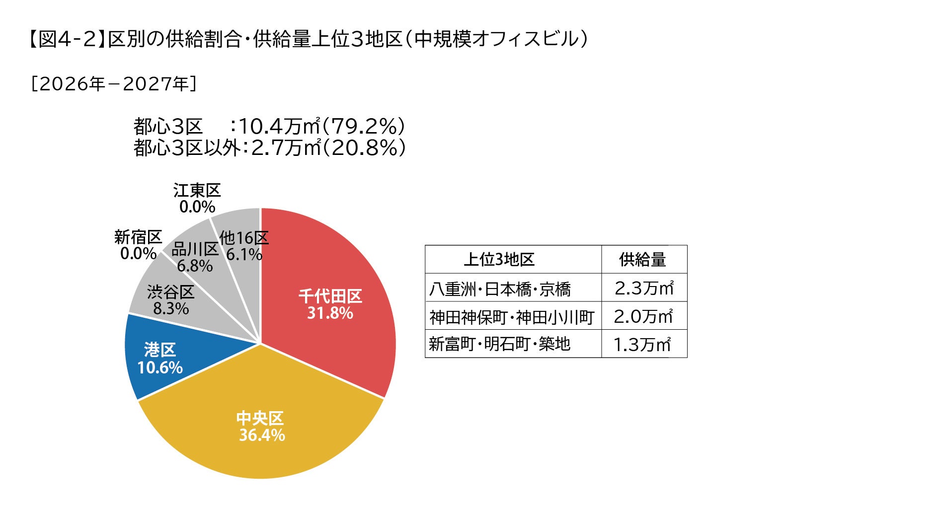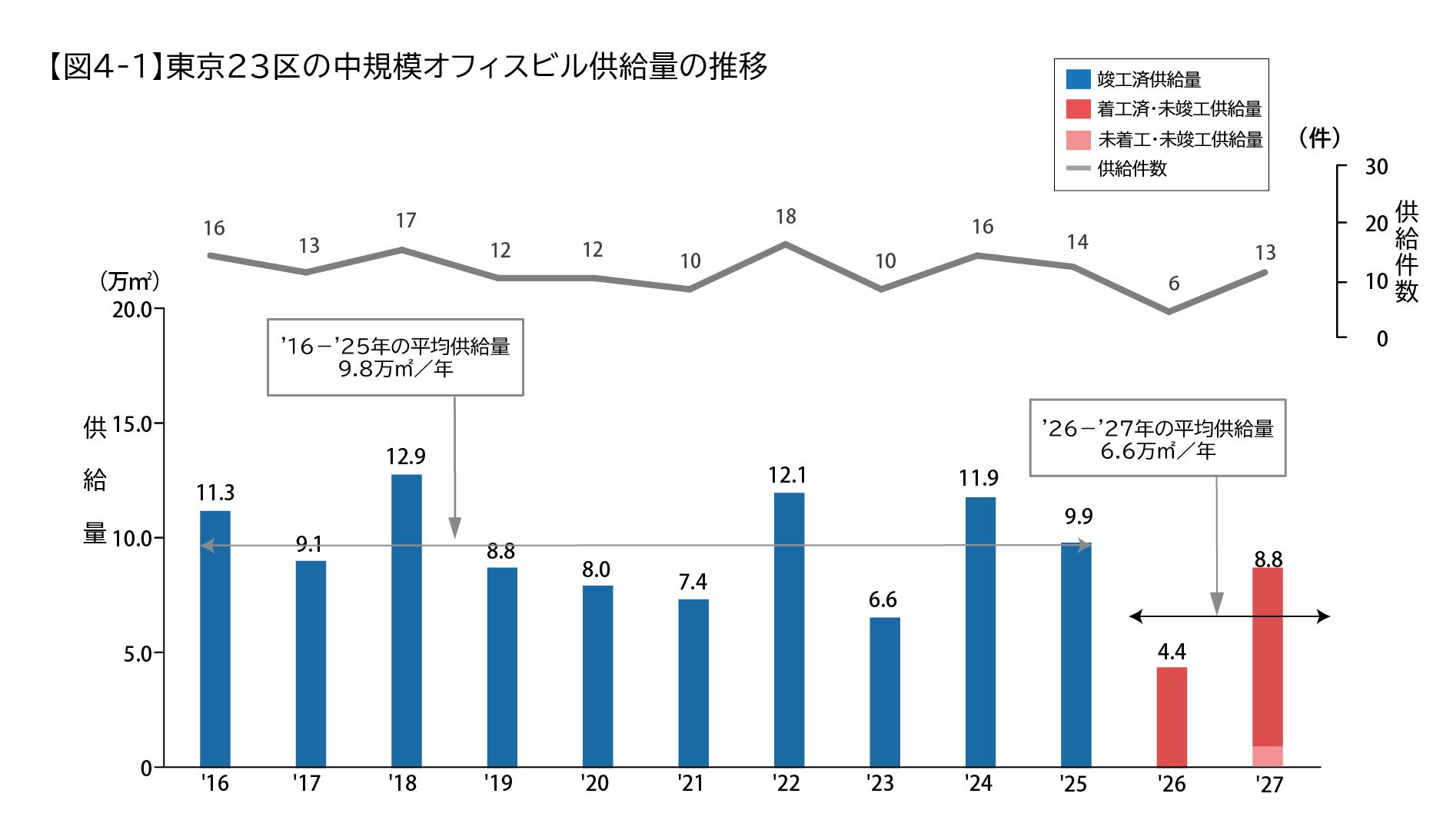 25年の中規模オフィスビル供給量は9.9万㎡となり、過去10年間の平均供給量9.8万㎡と同等の供給量となりました。26年は4.4万㎡と減少し、今後2年間の平均供給量は過去10年間の平均を下回る6.6万㎡となっていますが、27年は8.8万㎡と再び増加に転じる見込みです。