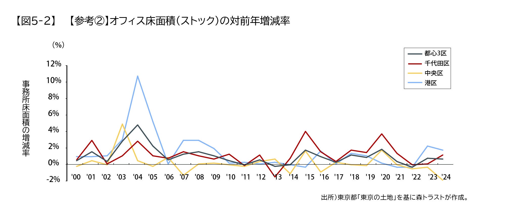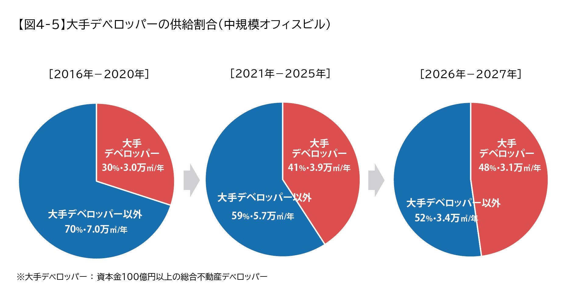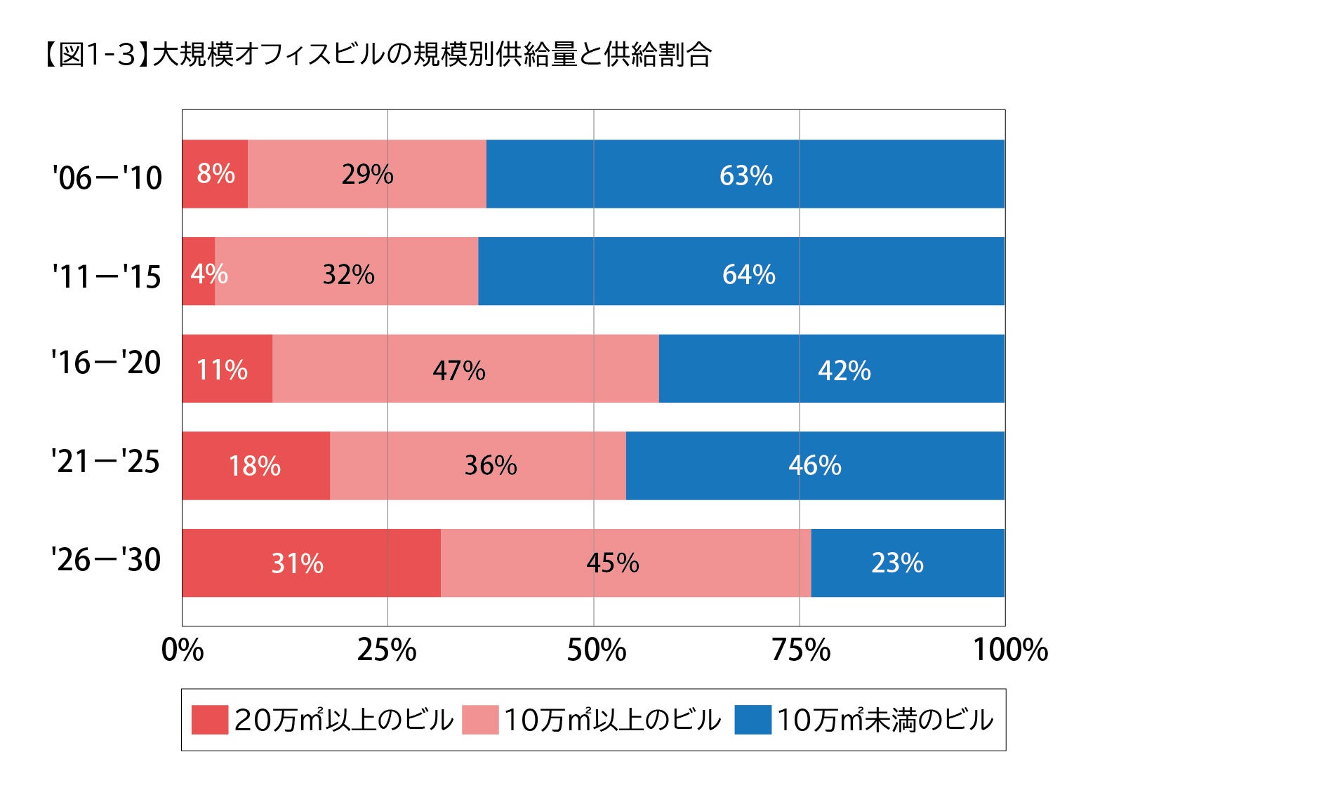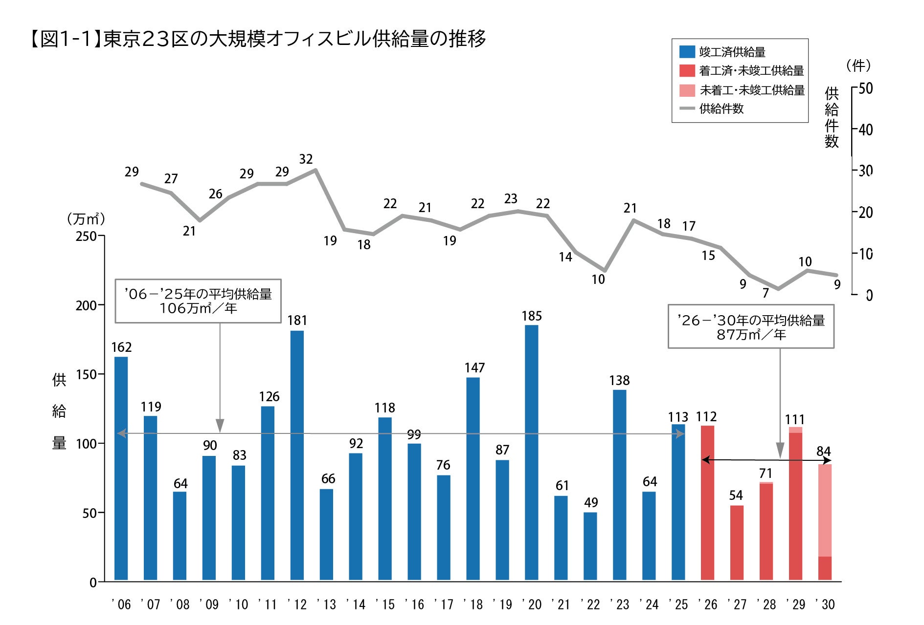 26年以降の5年間では、26年・29年は25年と同程度の供給が見込まれる一方、今後5年間の平均供給量は87万㎡(過去20年間の平均比77%)に留まる見込みです。