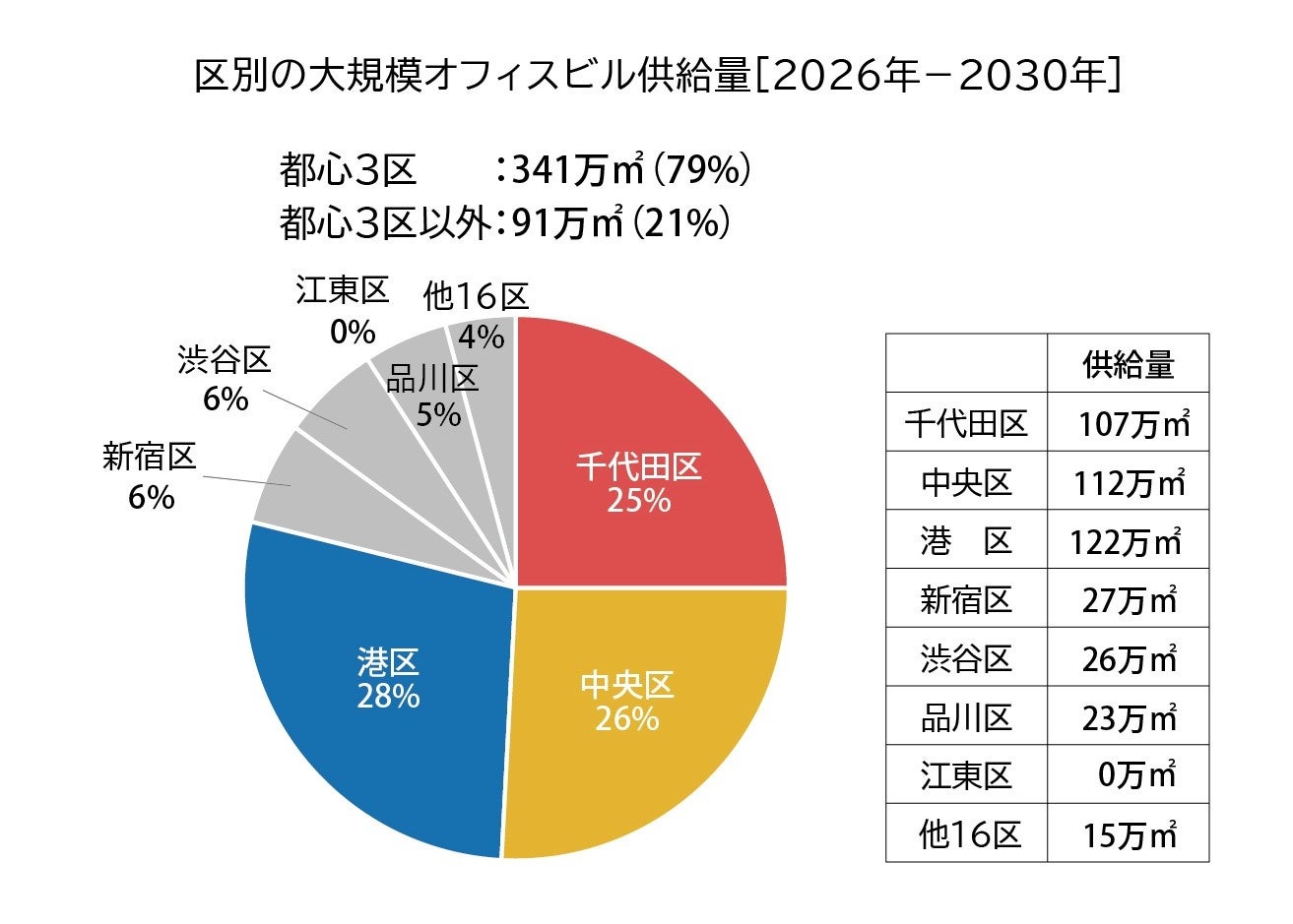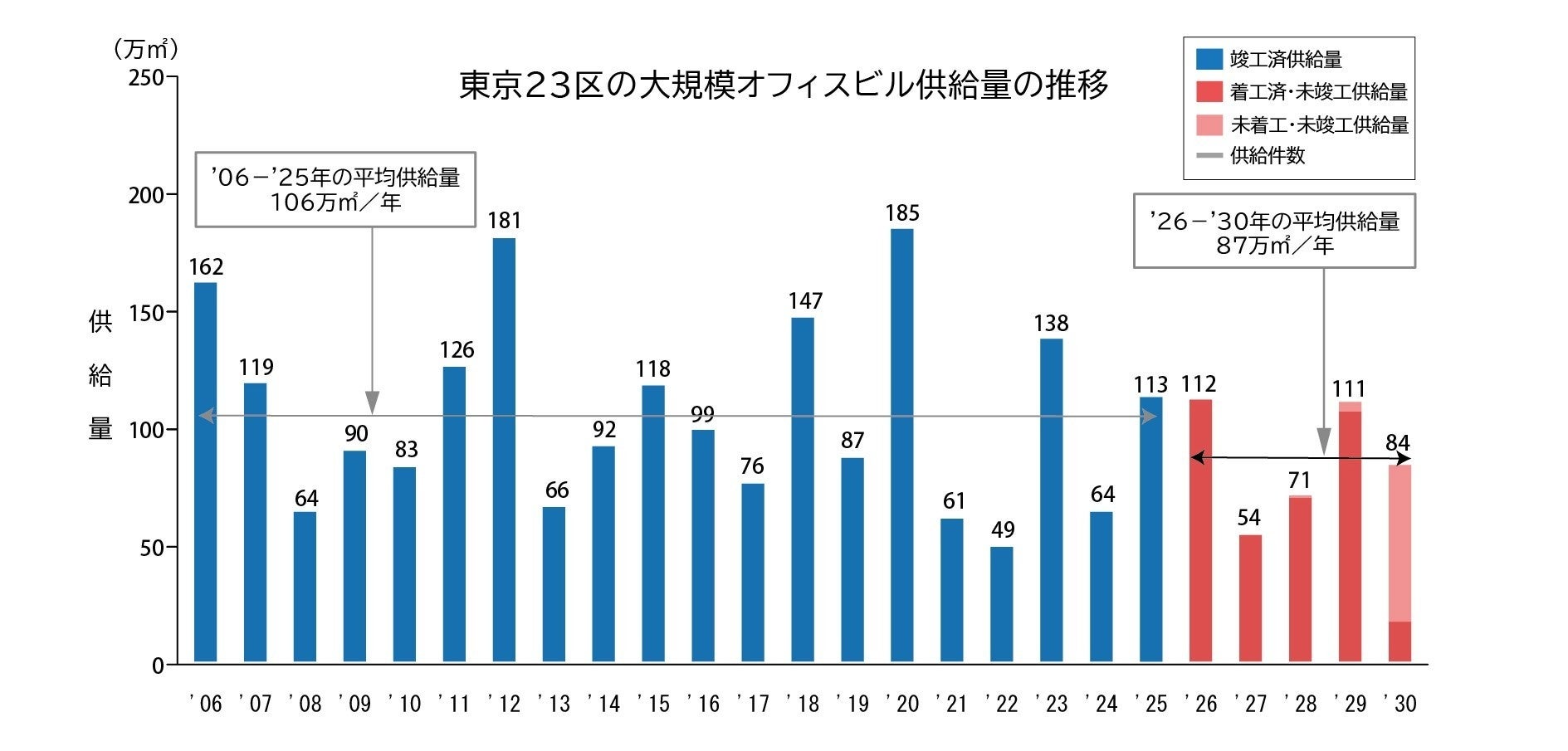 東京23区における25年の大規模オフィスビルの供給量は113万㎡(前年比176%)です。