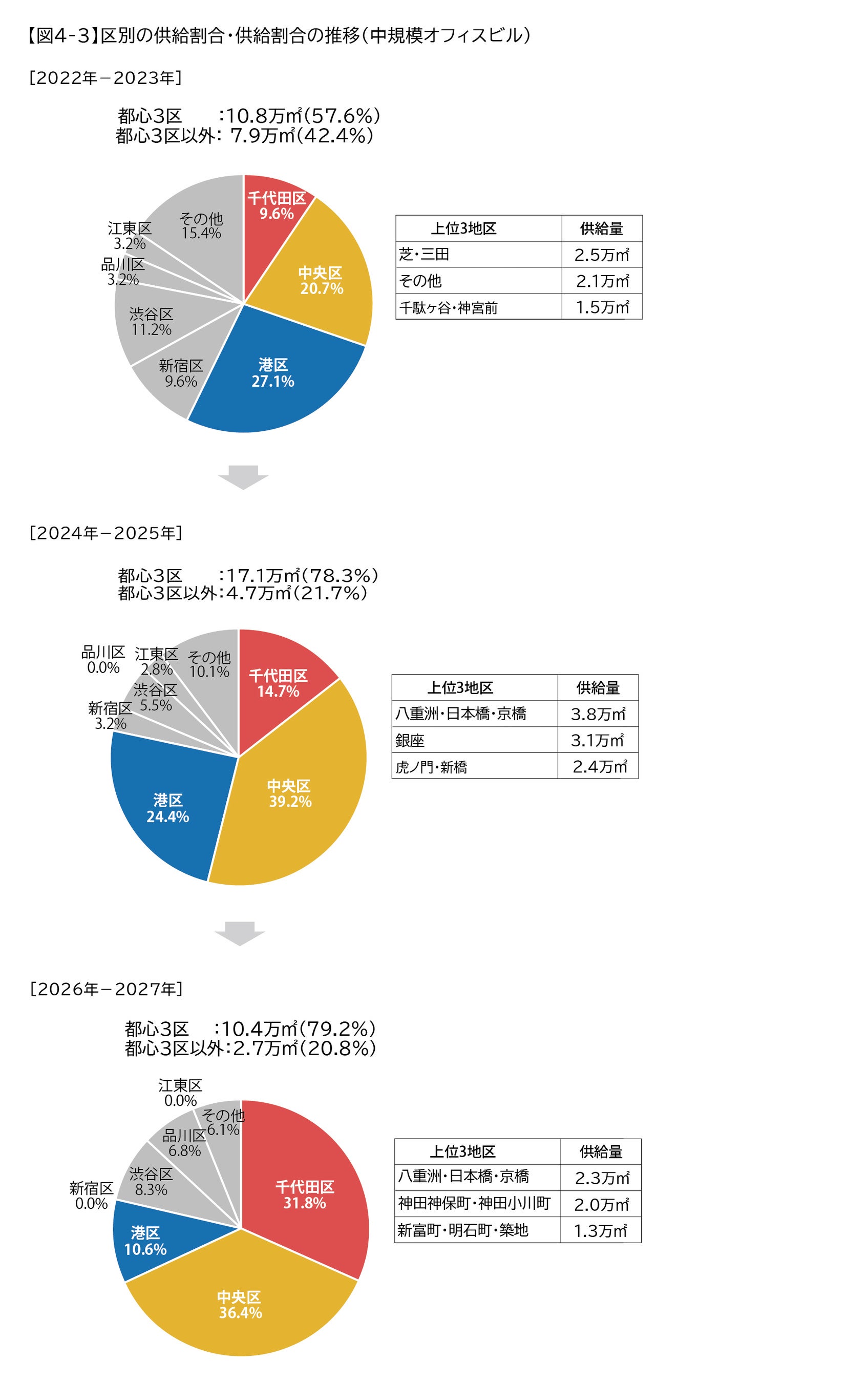今後5年間は、過去5年間と比較して、都心3区(千代田区・中央区・港区)への供給集中が進み、特に千代田区・中央区の比率が高まる見込みです。