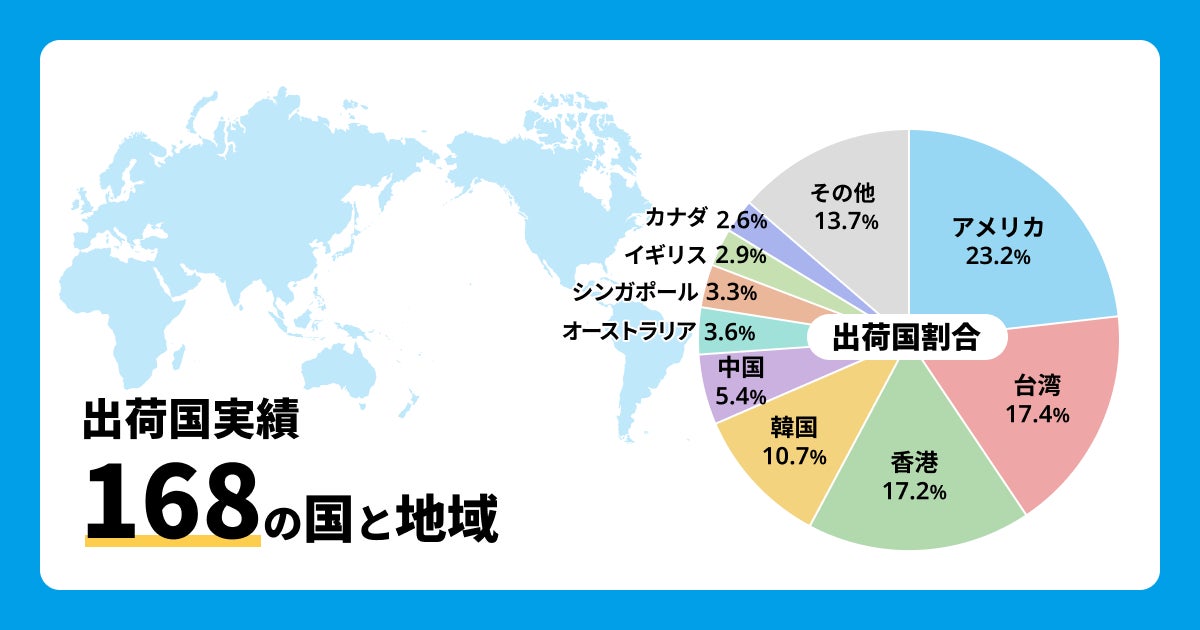 海外ユーザー向けに購入代行を行う「WorldShopping」において、2025年1月〜6月期の出荷国上位割合を見てみると、最も多かったのは「アメリカ」で23.2%、第2位は「台湾」で17.4%、第3位は「香港」で17.2%、出荷実績は168の国と地域となりました。