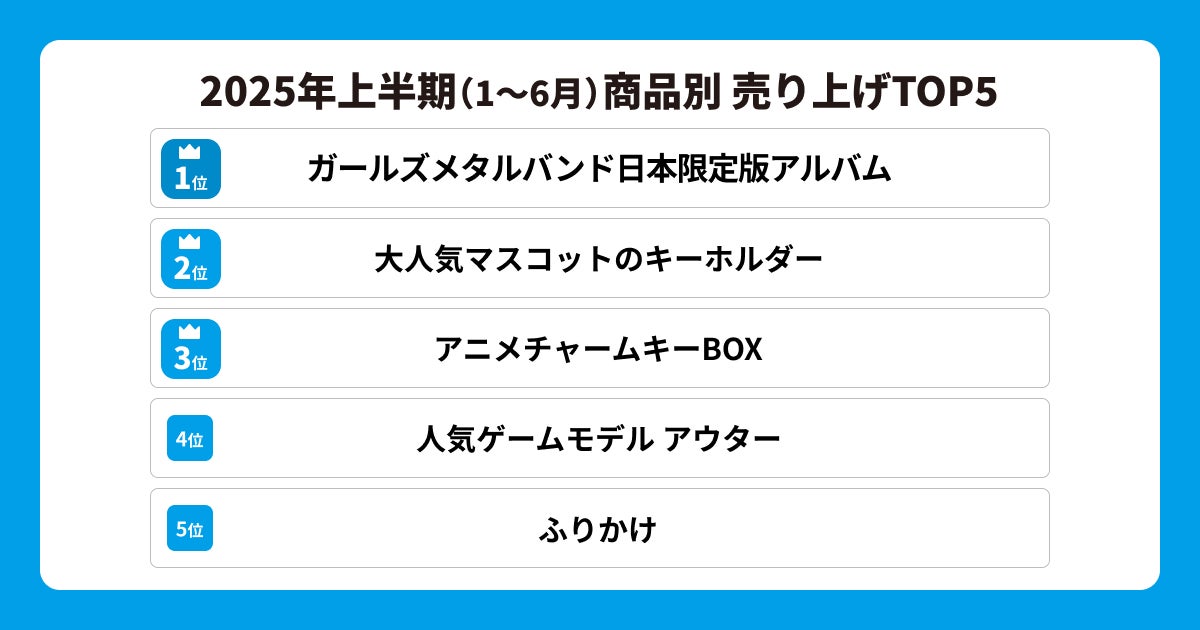 上半期の商品売り上げTOP5は、音楽・アニメなど、カルチャー関連の商品がランクインしました。特に「日本限定」の特典が付くアイテムや日本のみで販売する限定品は越境購入されやすく、公式でしか買えないものに需要があることがわかります。また、第5位にランクインした「ふりかけ」は根強い人気で、日本食への興味・関心が強いことが伺えます。