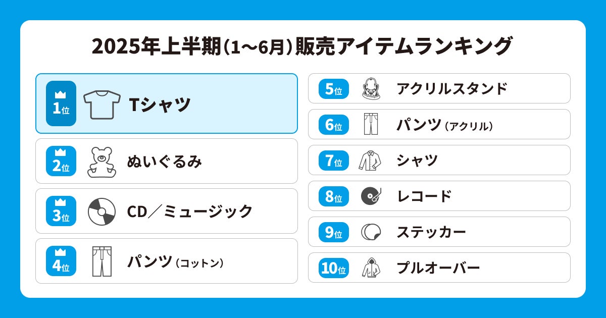 販売アイテムランキングの第1位は「Tシャツ」、第2位には「ぬいぐるみ」、第3位には「CD/ミュージック」のカテゴリがランクインしました。また、8位には「レコード」がランクイン。動画系SNSを発端として若い世代を中心に日本のシティポップが再燃していることが話題となっていますが、その影響が垣間見えます。