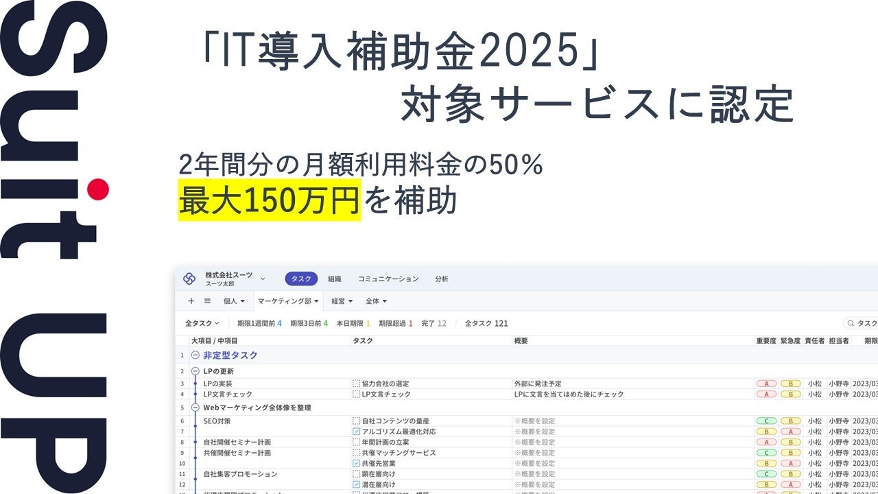 チームのタスク管理・プロジェクト管理ツール「スーツアップ」、「IT導入補助金2025」の対象サービスに認定