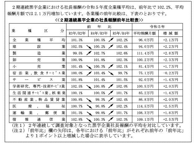 当指標は、全国11,400名の税理士・公認会計士で組織するTKC全国会の会員が、その関与先法人の役員報酬と役員退職金について、令和5年4月末時点で綿密に調査してまとめたもので、調査収録法人数は約10万社、役員数は約18万9千人にのぼります。