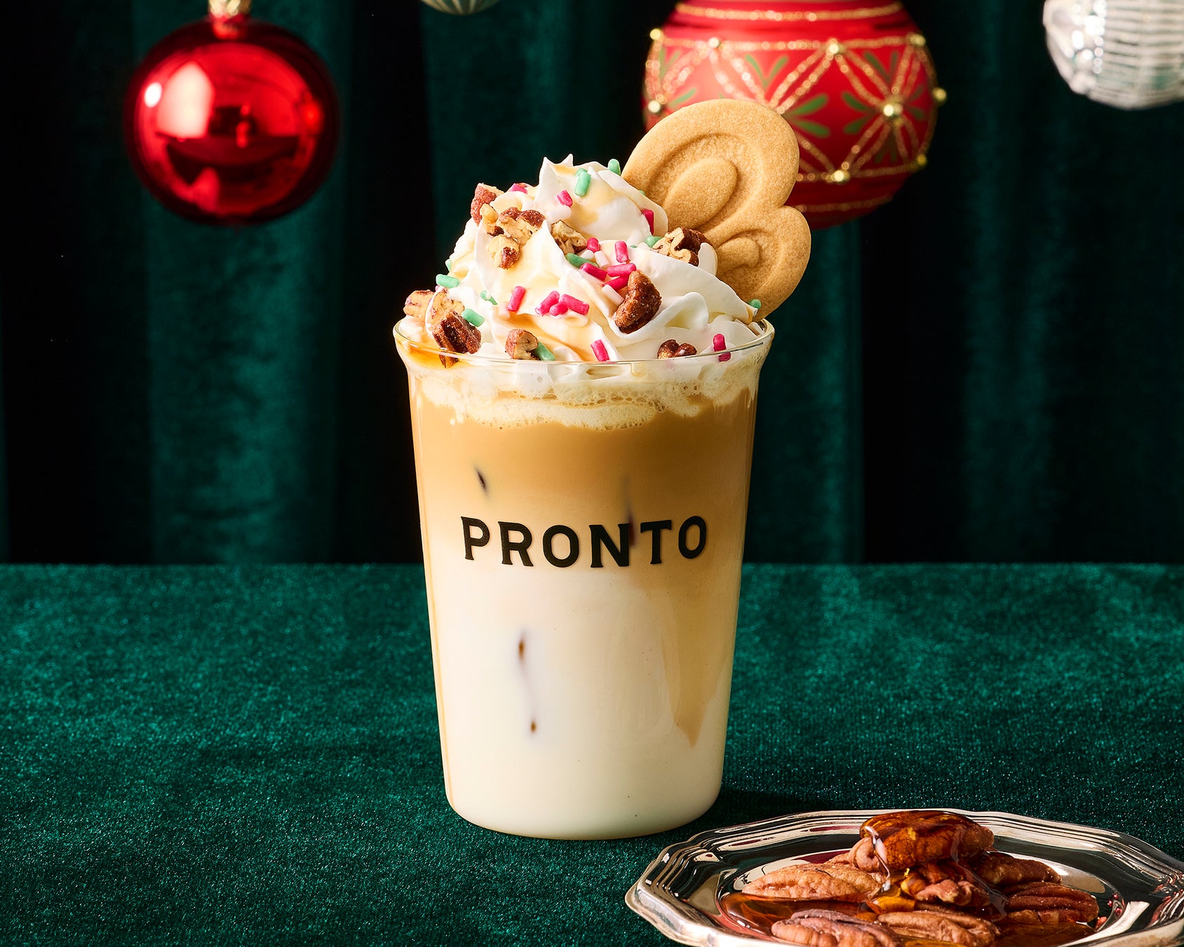 『PRONTO』のPラテシリーズに、冬季限定フレーバー「アイスメープルピーカンナッツラテ」が新登場。 ピーカンナッツの香ばしさとエスプレッソのコク にメープルフレーバーシロップ のやさしい甘さがマッチしたアイスラテです。「Pクッキー」 と一緒にお楽しみください。さらに、クリスマスシーズン限定(12月1日~25日)で、赤と緑のシュガートッピングが加わり、ホリデーシーズンを華やかに彩ります。