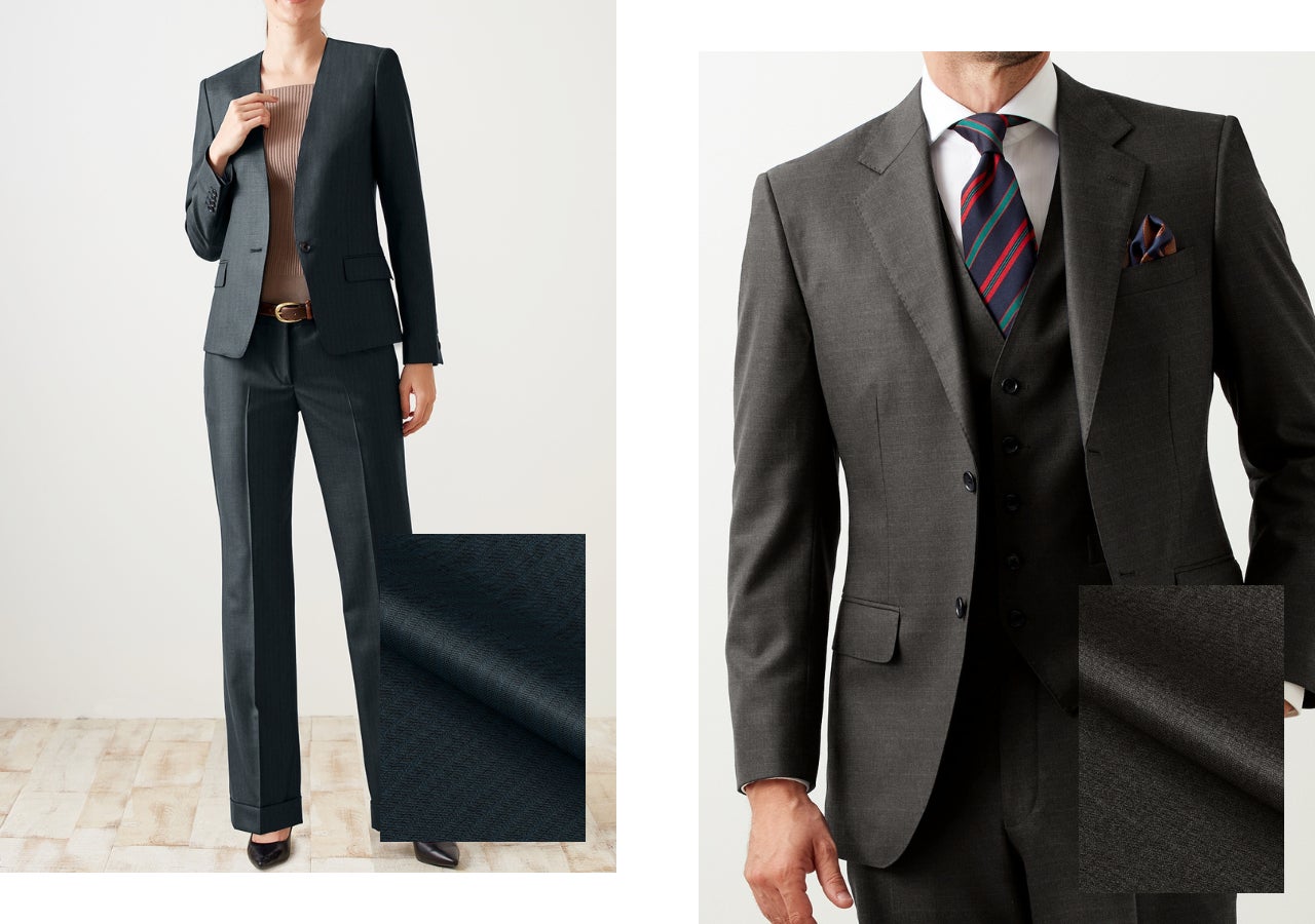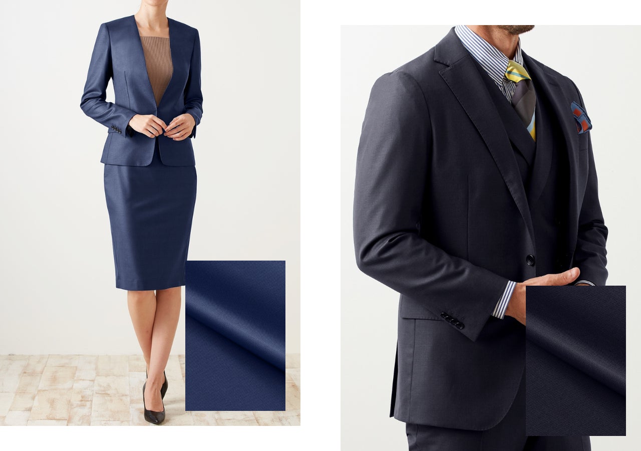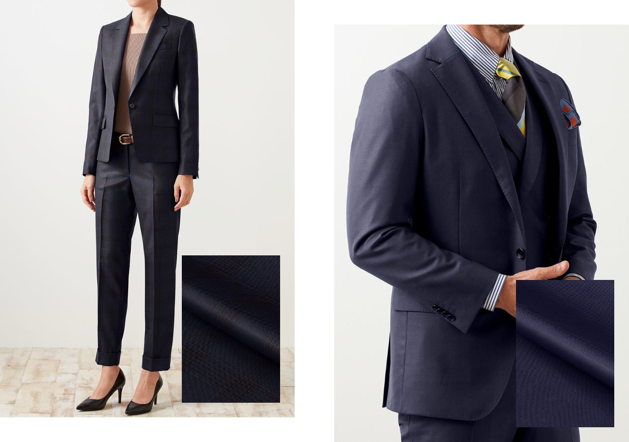 艶が美しく、仕上がりの見栄えが大変良い人気のコレクション。ウール100%でありながらストレッチ性に優れており、着心地も良いのが特徴です。