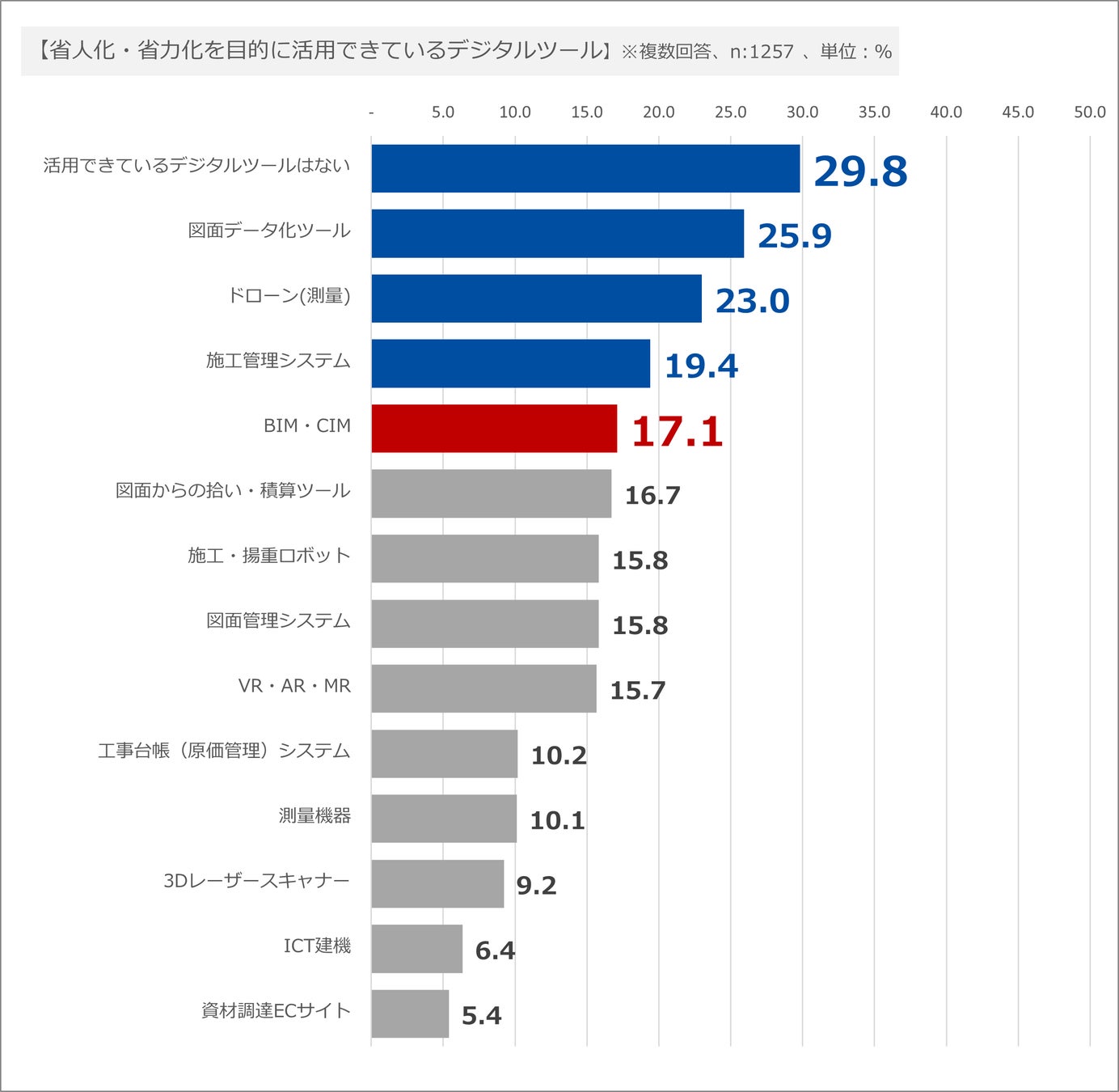 ●「省人化(生産性向上)や省力化(業務効率化)を目的に、活用できているデジタルツールを教えてください(複数回答可)」と質問したところ、官民で注力する「BIM・CIM」を、省人化 ・省力化を目的に活用できているとの回答は17.1%にとどまりました。