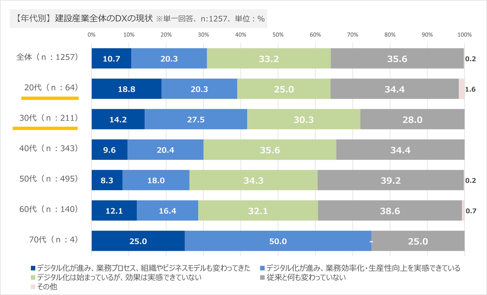 ●年代別に「建設DXの現状」に対する考えを見てみると、20代、30代といった次世代リーダー層では、「デジタル化が進み、業務プロセス、組織やビジネスモデルも変わってきた」または「デジタル化が進み、業務効率化・生産性向上を実感できている」との回答が他の年代に比べ多いことが分かります。
