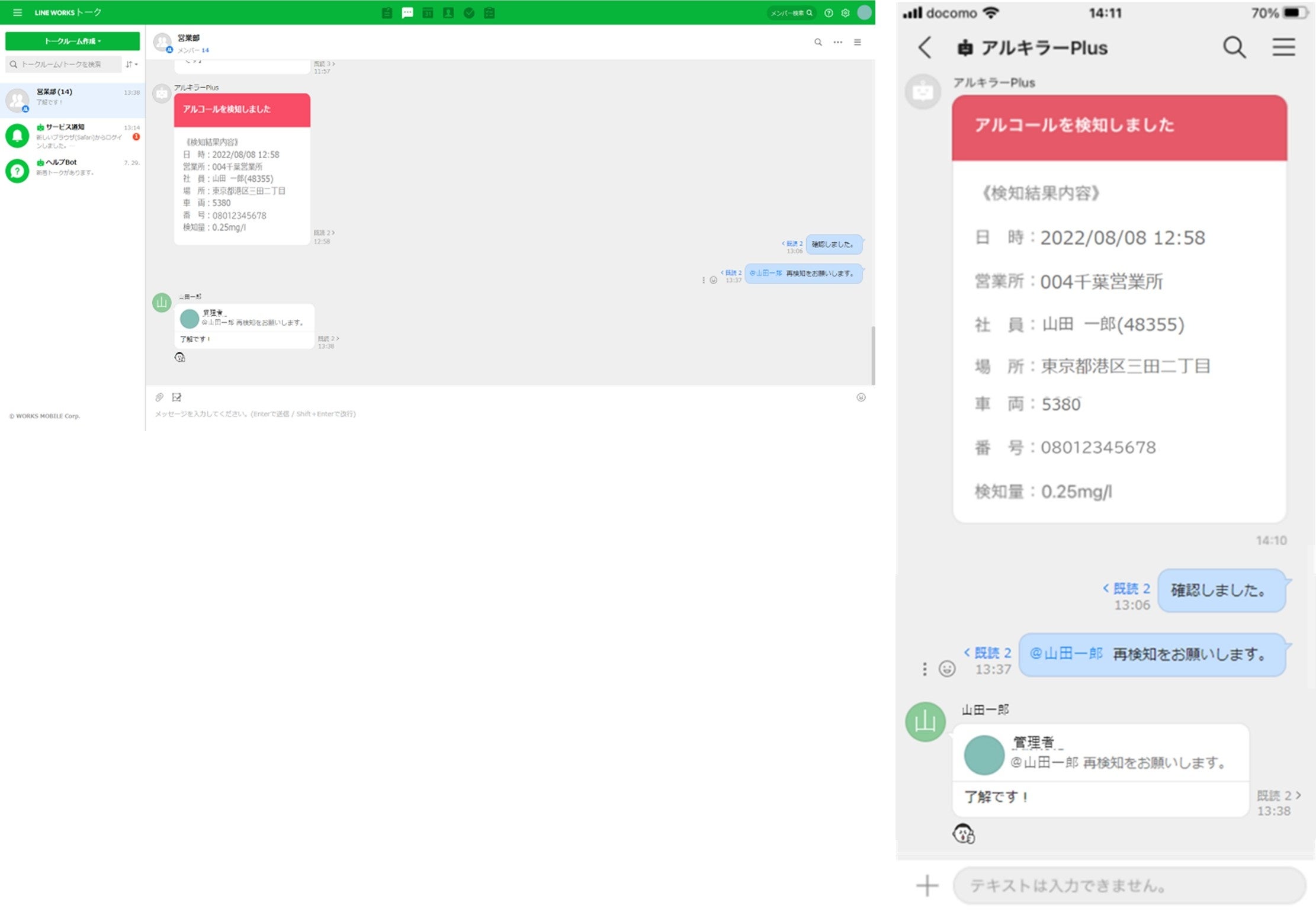 「アルキラーPlus」と「LINE WORKS」が連携 アルキラーPlusがアルコールを検知すると、管理者のチャットに通知・即対応が可能に