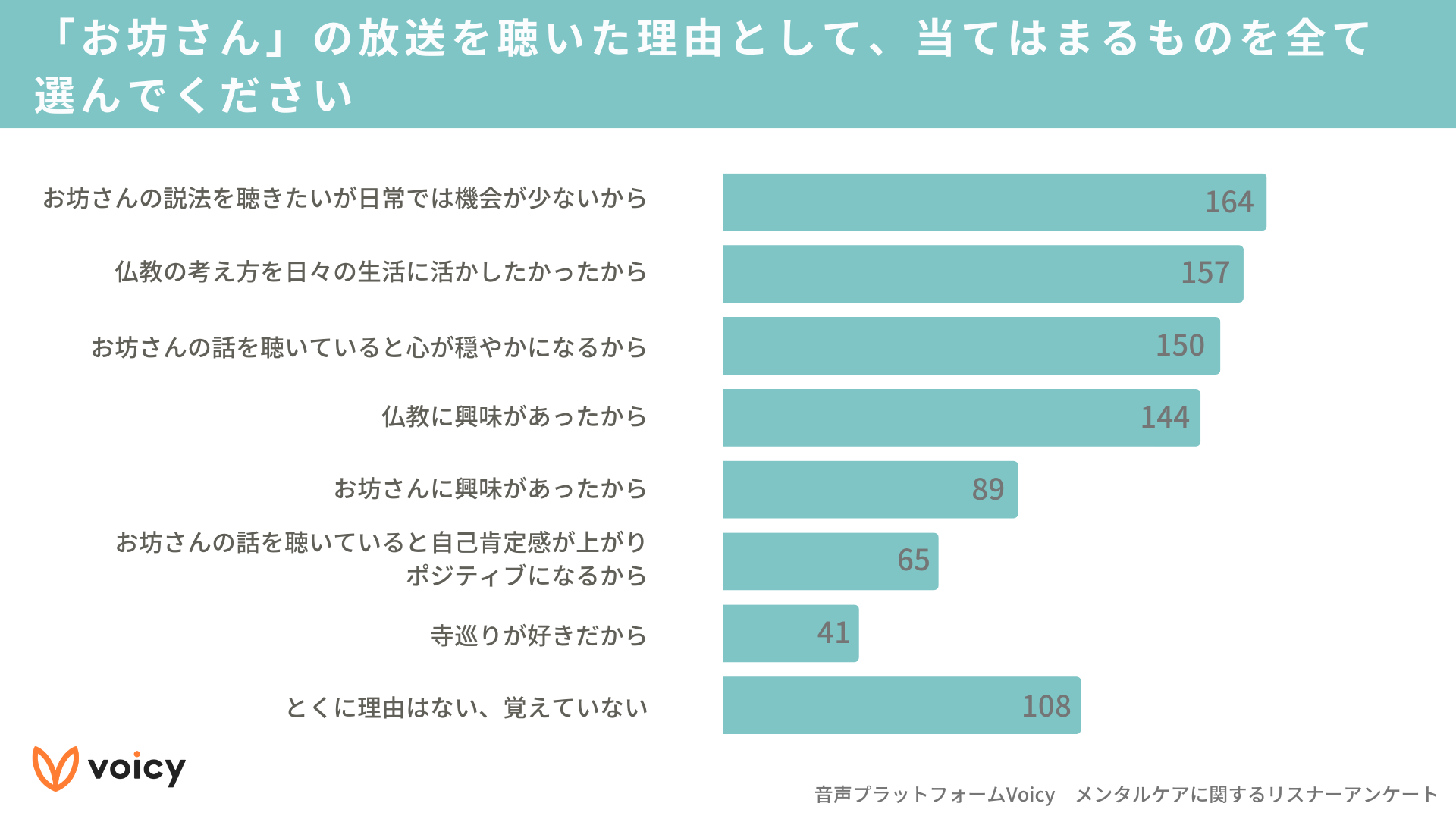 1年以内にお坊さんの放送を聴いた人を対象に、聴いた理由を聞いたところ、「お坊さんの説法を聴きたいが日常では機会が少ないから」に次いで「仏教の考え方を日々の生活に活かしたかったから」となりました。日常生活では、お坊さんと話したくても機会が少なかったり、方法がわからなかったりする人も多いのではないでしょうか。こうした需要とともに、様々な場で活躍するパーソナリティが集うVoicyでは、説法を用いて不安や悩みに対して解決方法を説くお坊さんの放送の人気が高まっています。