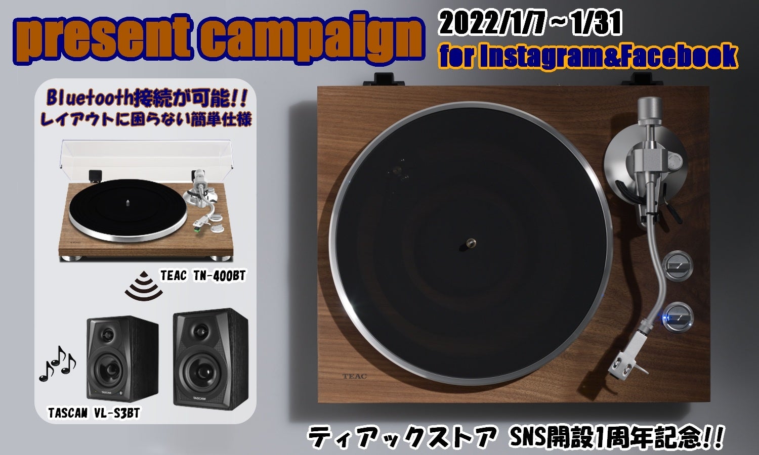 - Facebook・Instagram:Bluetooth®対応レコードセット(TEAC TN-400BT、TASCAM VL-S3BT) 1名様