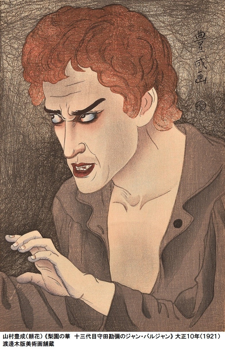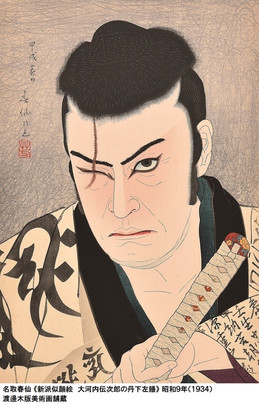 渡邊版画店の主要な画題のひとつであった役者絵。山村耕花(豊成)、名取春仙の歌舞伎役者の似顔絵作品を見た庄三郎が声をかけ、江戸時代の浮世絵とは異なる新しい時代の役者絵が生まれました。