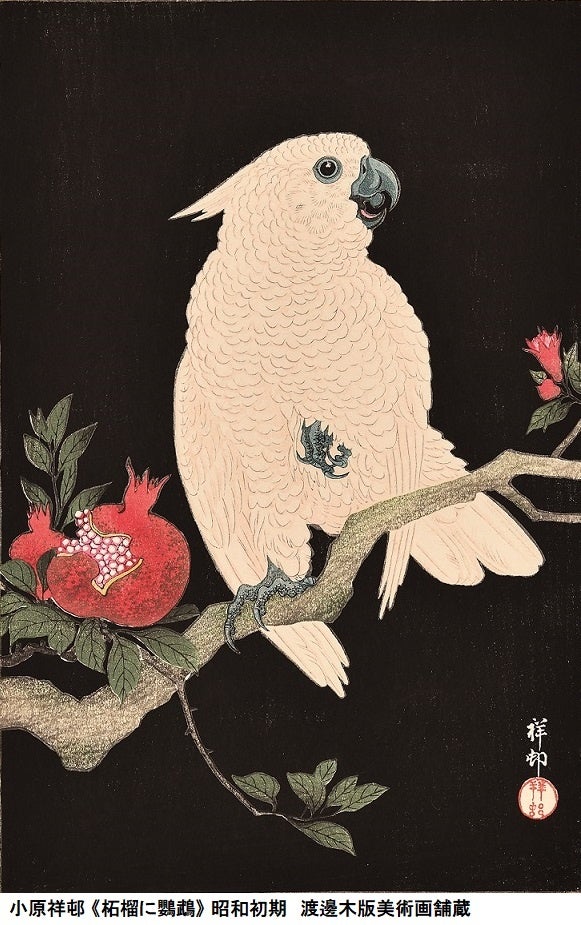 花鳥新版画の中でも特に小原祥邨の作品は海外で人気を博し、昭和8年(1933)にポーランドで開かれた国際木版画展覧会では967枚もの注文が入ったほどでした。モダンな明快さと日本的な情緒の絶妙なバランスは、このジャンルにおける魅力のひとつです。