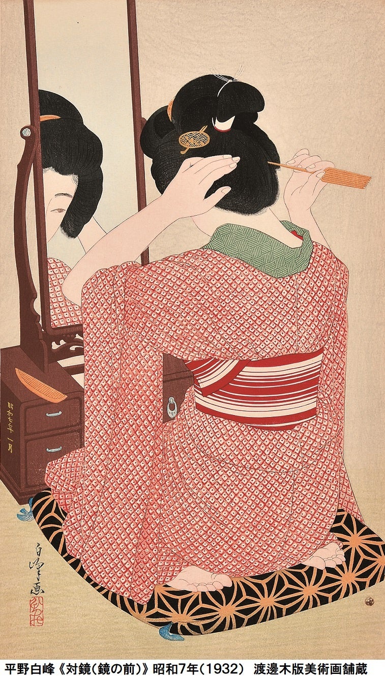 江戸時代に確立された浮世絵版画の伝統的な技法を用い、高い芸術性を意識した、明治以降の画家による新しい木版画の取組みが「新版画」の始まりとされています。これを牽引し、世に広めたのが版元・渡邊版画店(現在の渡邊木版美術画舗)の渡邊庄三郎(1885-1962)です。庄三郎は、鏑木清方門下生を中心とした新進気鋭の画家たちを絵師に起用し、絵師、彫師、摺師の協業のもと、それまでにない複雑かつ華麗な彩色に手摺りならではの技法を駆使し、木版画による新たな芸術を世に問いました。