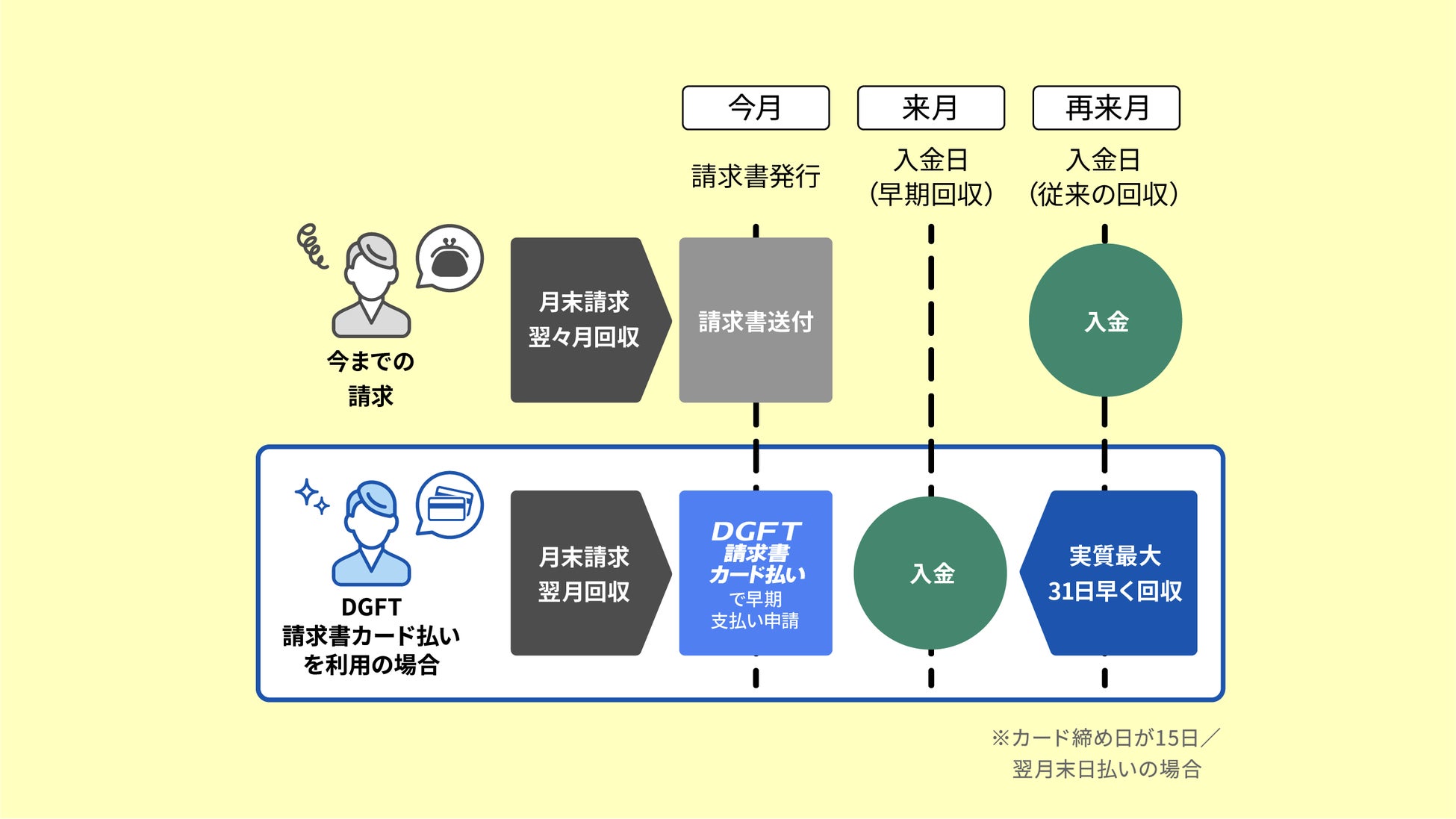 「DGFT請求書カード払い for請求者」は、商品等の購入の際の支払い方法を銀行振込からカード決済に切り替えてもらうことで、請求者の売掛金の早期回収を実現するサービスです。本サービスにより、請求者は資金繰りを改善できるとともに、未入金リスクの低減にもつなげることが可能となります。