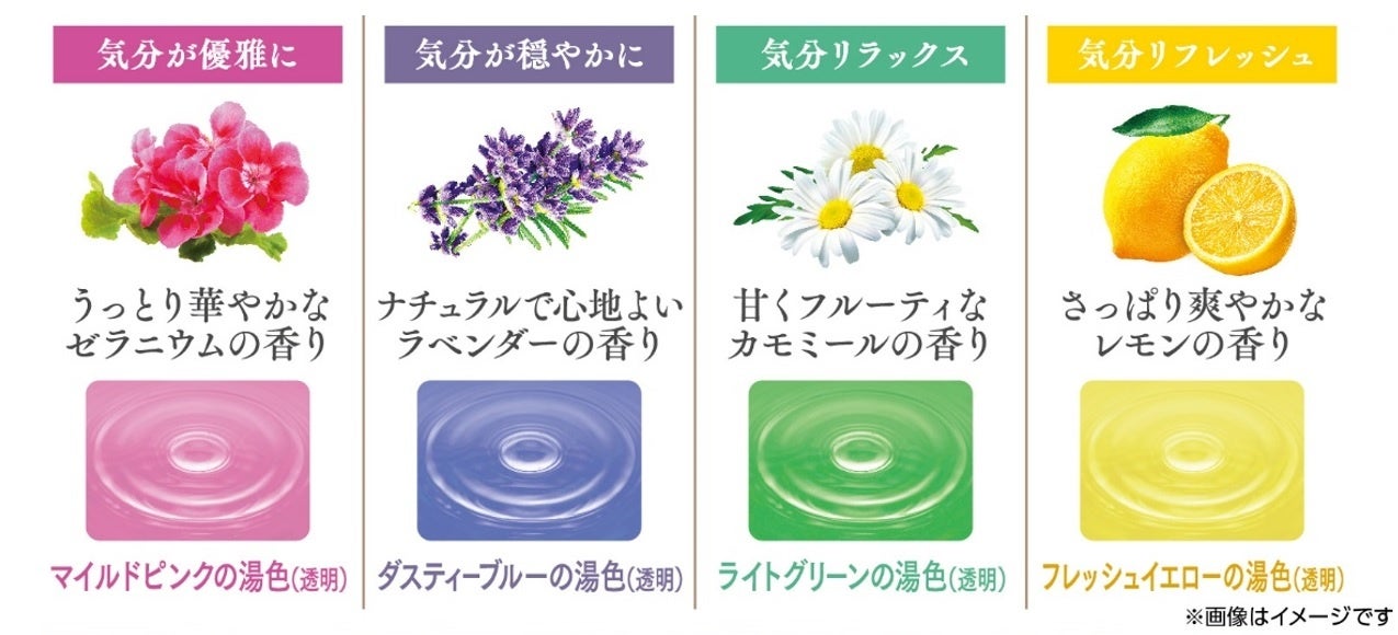 販売名:温泡アロマ(ゼラニウムの香り、ラベンダーの香り、カモミールの香り、レモンの香り)