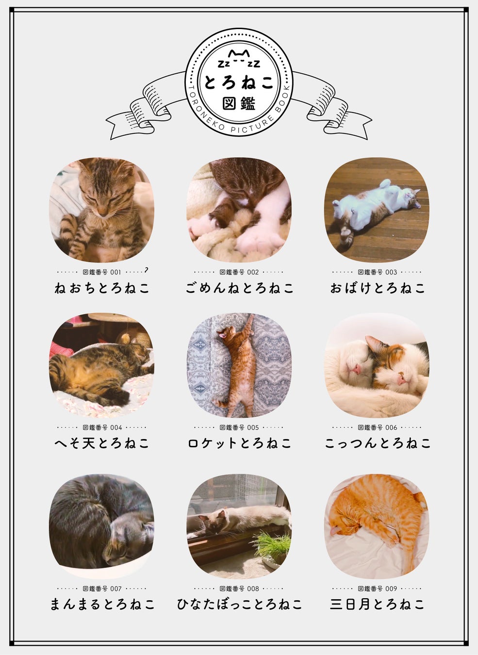 図鑑にまだ記録されていないとろねこの寝相を発見された方は、「#とろねこチャレンジ」のハッシュタグと共に、オリジナルの名前をつけてTwitterに投稿いただくと、公式サイト内で新種として紹介させていただくことがございます。
