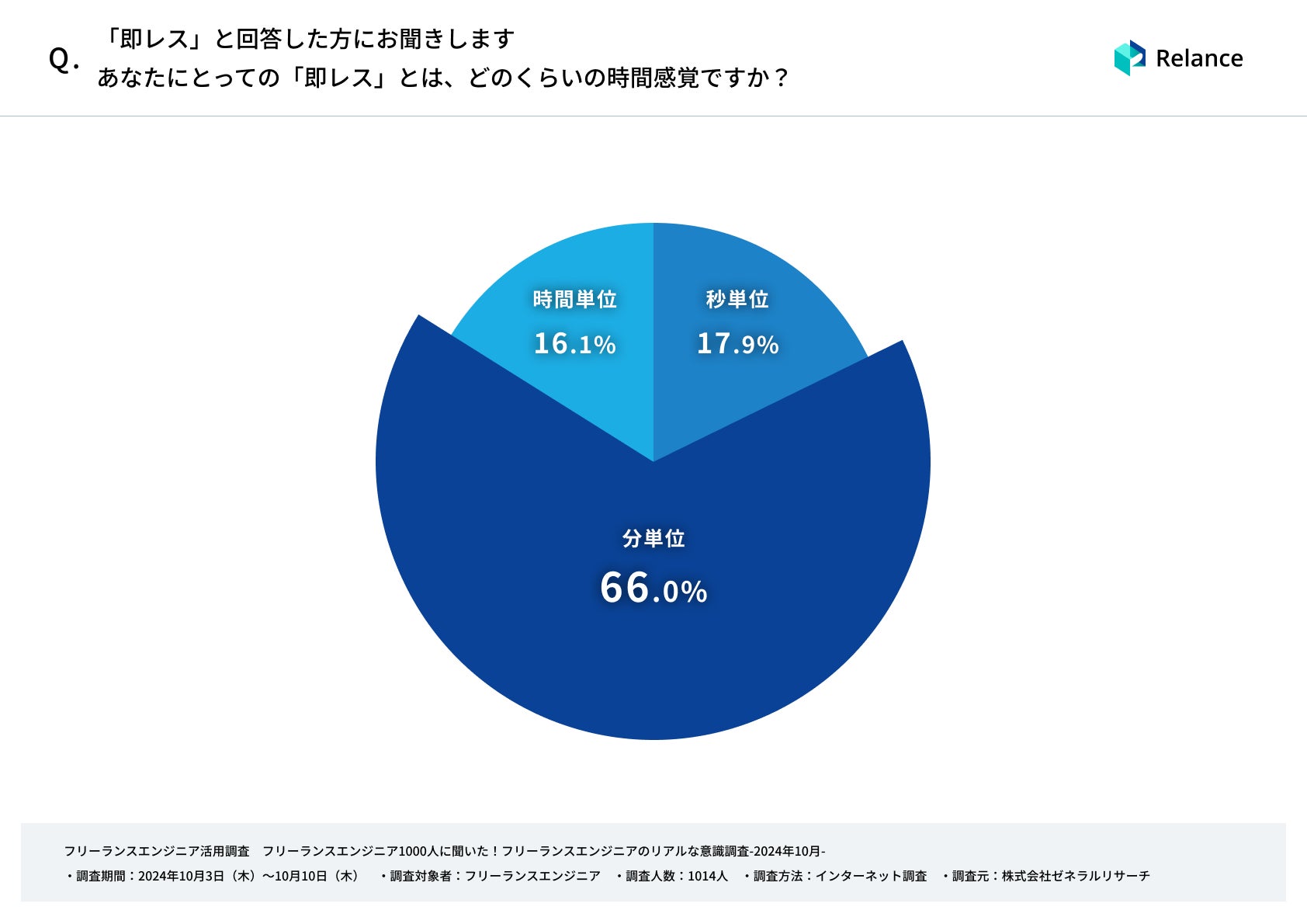 66.0%が「即レス」の時間感覚を「分単位」と考えていることがわかりました。クライアントやチームとの円滑な連携を重視し、迅速な対応が信頼構築や案件継続に繋がると考えられます。自分でボールを持つ時間や数が増えるとそれが認知負荷になったり、チームの作業進捗に影響を及ぼす可能性もあるため、速いレスポンスを心掛けているのではないでしょうか。