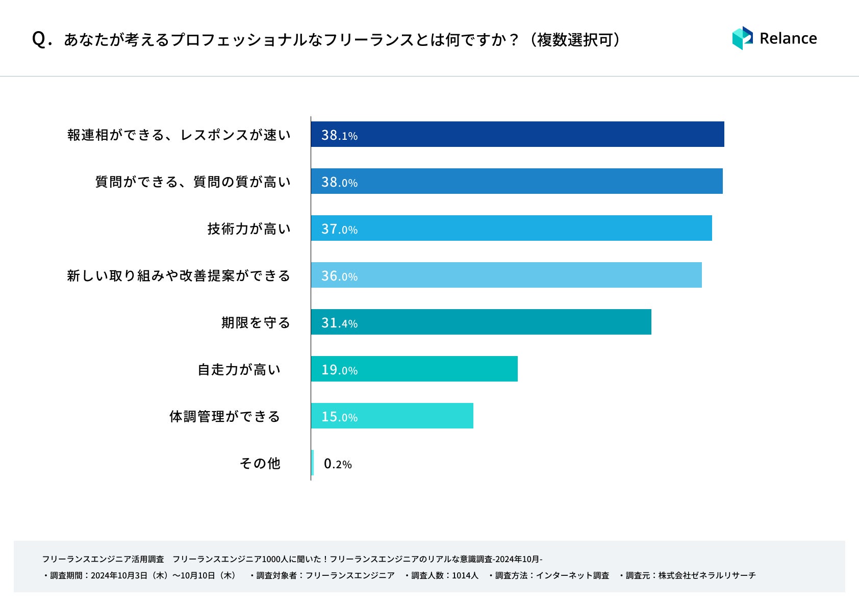 注目すべきは「技術力が高い」よりも、「報連相ができる、レスポンスが速い」38.1%、「質問ができる、質問の質が高い」38.0%の二つが多い回答結果となりました。「新しい取り組みや改善提案ができる」「期限を守る」も近しい回答割合であることから、一ビジネスマンとしてどうあるべきかを大事にしている方が多いのではないでしょうか。技術力が高いことだけがプロフェッショナルなフリーランスとは言えないのかもしれません。