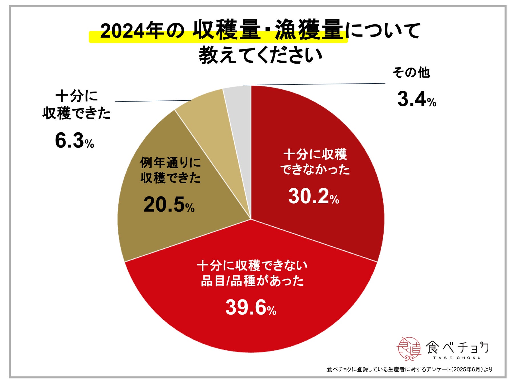 2024年の収穫状況について例年以下と回答する生産者は、69.8%となった。30.2%が「十分に収穫できなかった」、39.6%が「十分に収穫できない品目/品種があった」と回答しました。