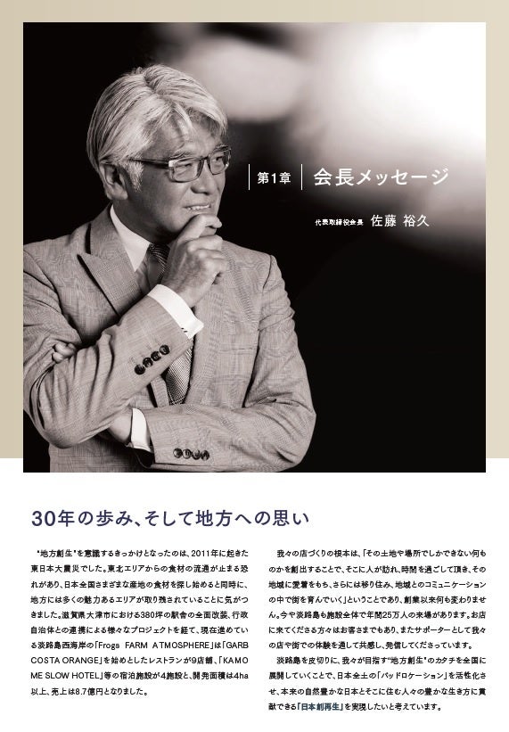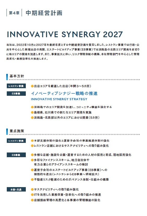 当社は、2021年7月期より報告セグメントを変更し、食の持つ可能性を飲食収益だけでなく、食の力で活性化した土地・不動産による収益を見込むエステートビルドアップ事業を始動しており、「飲食の会社」というだけでなく、淡路島はじめ日本全国を対象とした「食から始まる地方創再生」を行い、地方創生分野でのリーディングカンパニーを目指しております。