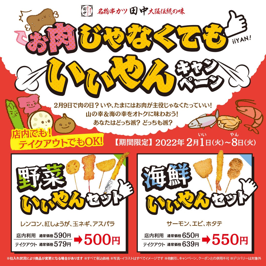 株式会社串カツ田中ホールディングス(本社:東京都品川区東五反田、代表取締役社長:貫 啓二、以下:串カツ田中)は、2月1日(火)~8日(火)の期間限定で「お肉じゃなくてもいいやん」キャンペーンを実施いたします。