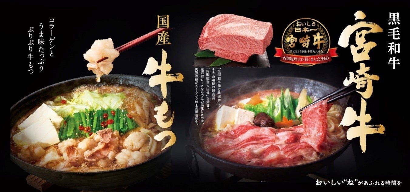 今回使用する国産牛もつは、たっぷりの「コラーゲン」と「うま味」、「ぷりぷり」の食感が特徴。また黒毛和牛宮崎牛は、「全国和牛能力共進会」で4大会連続の最高賞「内閣総理大臣賞」を受賞。肉質等級がA4ランク以上の黒毛和牛で、「おいしさ日本一」の牛肉です。厳選した肩ロースを使用し、とろける霜降りと甘く芳醇な香りが特徴です。