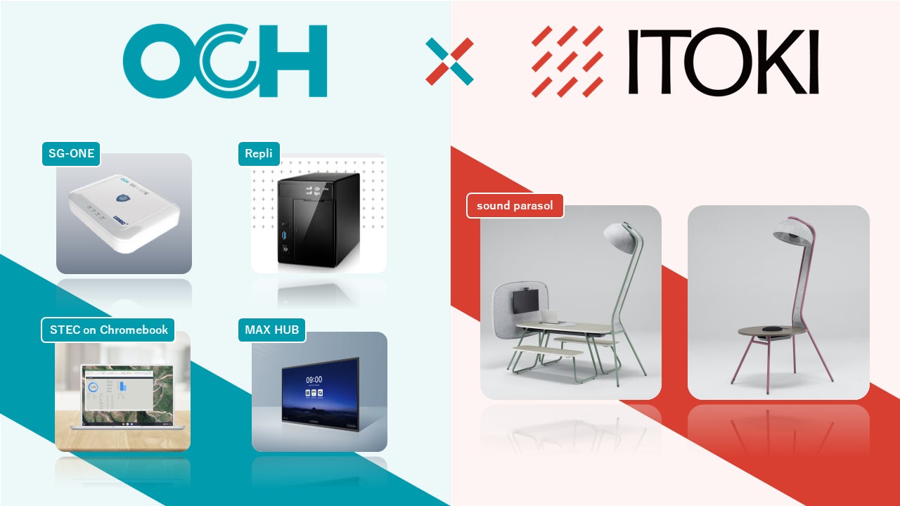 イトーキは、OCHと共同で出展し、『働く場所にとらわれない「情報」のあたらしい共有とセキュリティ』をテーマに、いつでもどこでも誰とでも、多様な働き方の人どうしが自由に協働できる環境を支える、コミュニケーションツール・インフラ環境を出展ブース内でご提案します。