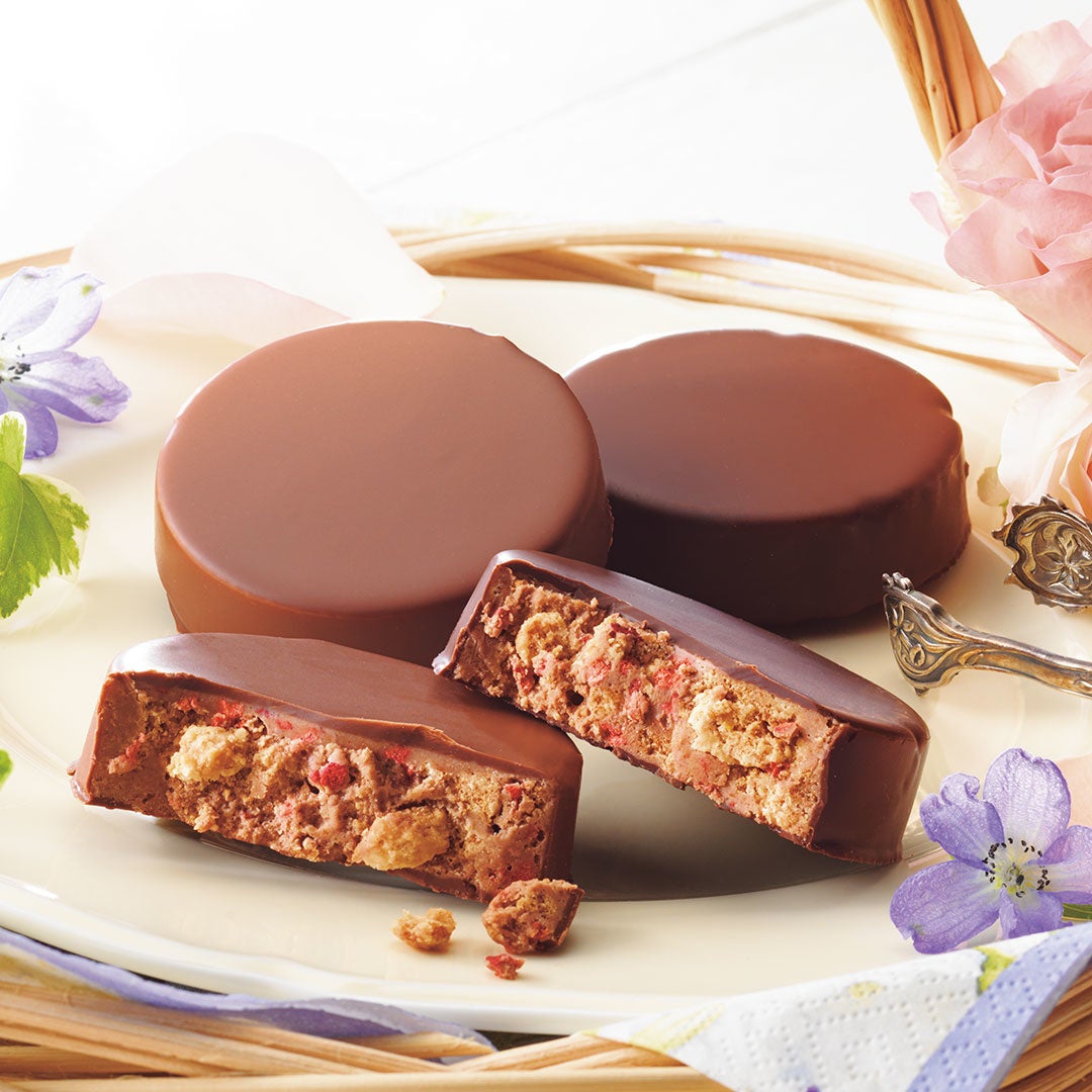 英国で親しまれているお菓子「チョコレートティフィン」をロイズのレシピでアレンジ。クランブルとフリーズドライのストロベリーをなめらかなチョコレートでひとつにし、仕上げに[スイート]と[ミルク]、2種類のチョコレートでコーティングしました。ザクザクとしたクランブルとサクサクのストロベリー、外側のチョコレートとの食感のバリエーションをお楽しみください。