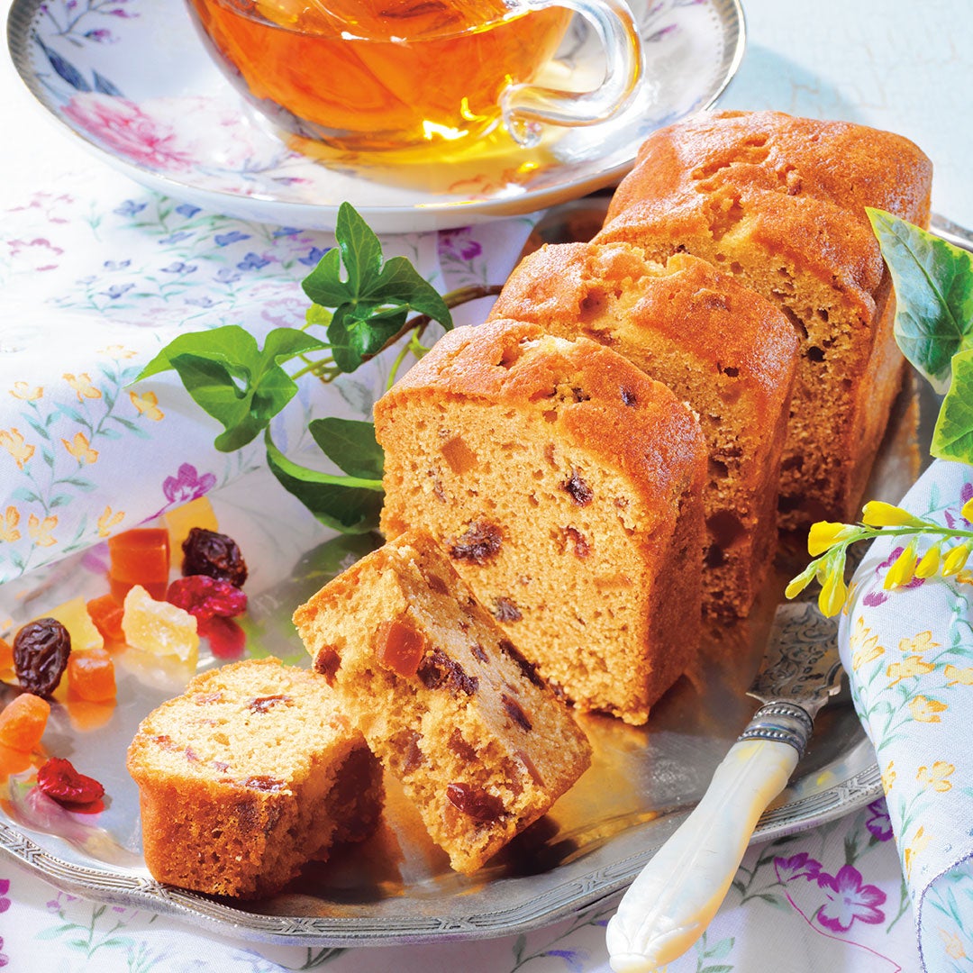レモンと紅茶の風味をつけた生地に、紅茶が香るレーズン、クランベリー、パパイヤ、パイナップルを入れて焼き上げたパウンドケーキ。たくさんのフルーツと、仕上げにしみ込ませたエルダーフラワーのシロップが、甘酸っぱくさわやかに香ります。