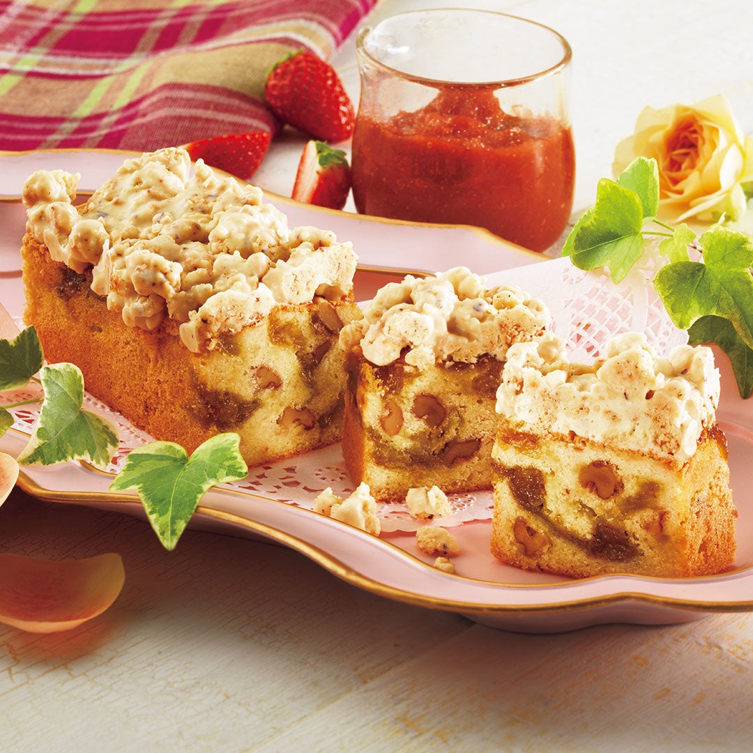ルバーブとストロベリーの自家製ジャム、クルミを入れて焼き上げた生地の上に、ホワイトチョコレートでコーティングしたヘーゼルナッツ味のクランブルをのせました。さわやかな酸味を味わえるしっとりとした生地と、クルミとクランブルのザクザクと香ばしい食感がひとつに。多彩な味わいが調和する贅沢なケーキが、ティータイムを特別なひと時にしてくれます。