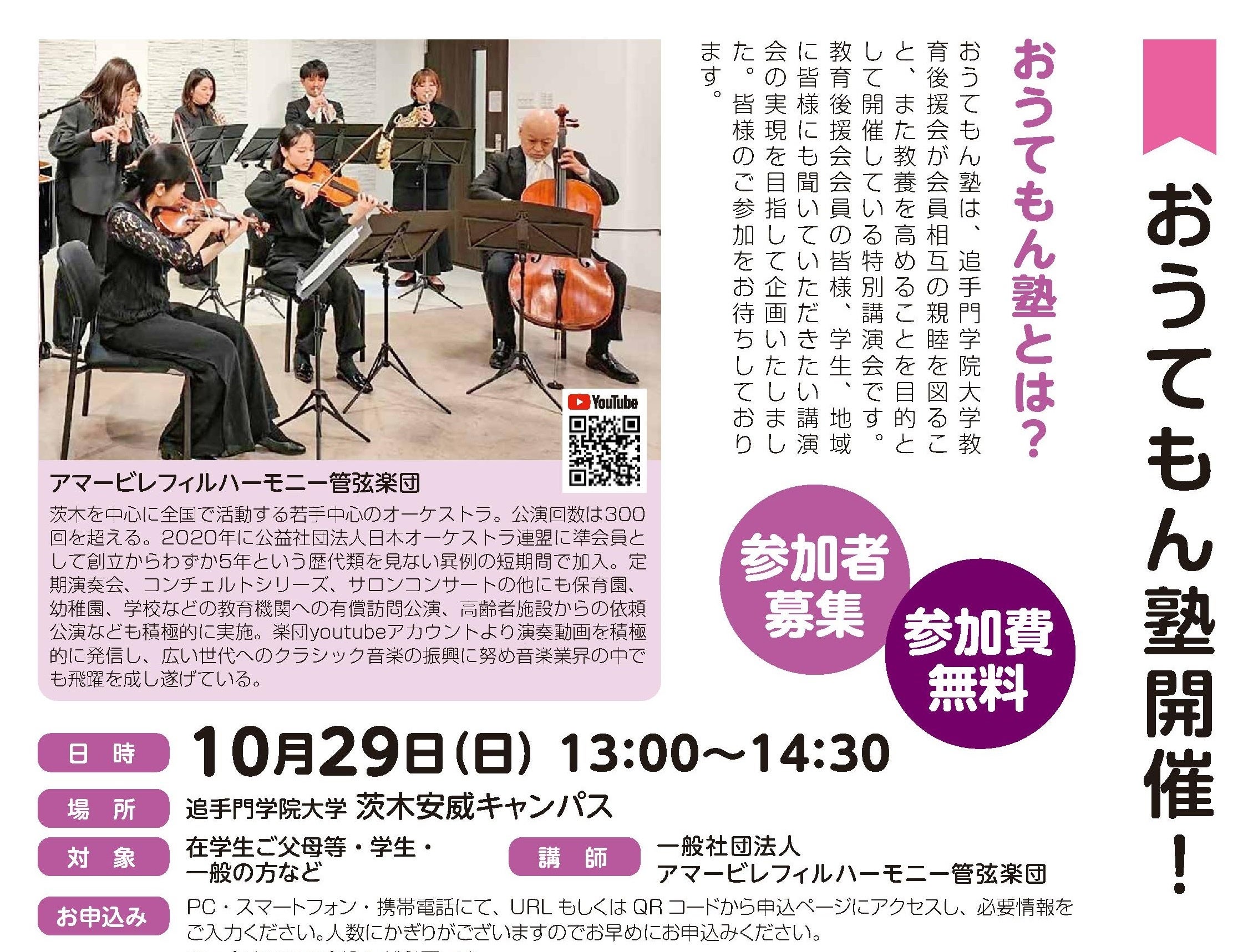 大学のある大阪府茨木市を拠点に活動し、「若手演奏者にもっと演奏の場を」と楽器店が立ち上げた日本で唯一のプロオーケストラ「アマービレフィルハーモニー管弦楽団」の演奏会を10月29日、追手門学院大学(略称:追大、大阪府茨木市、学長:真銅正宏)で開催します。
