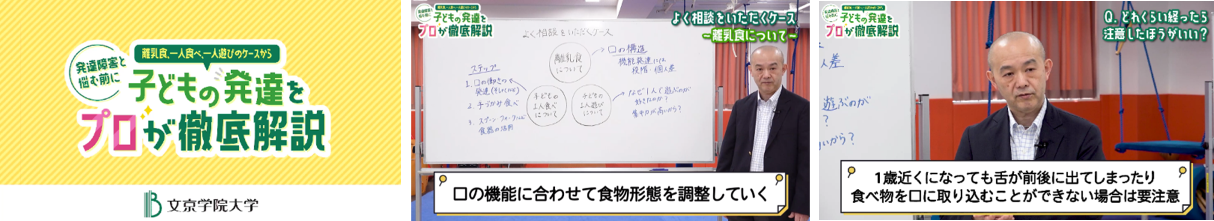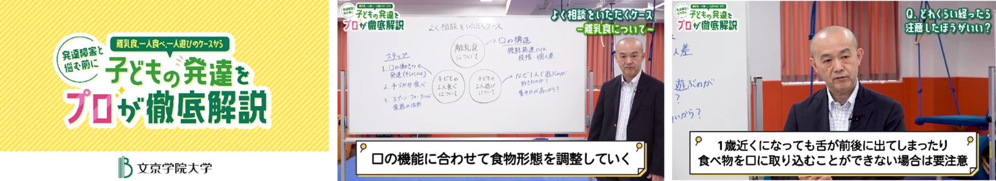 今回の動画は、離乳食や一人食べ、一人遊びなど、保護者から相談を受けることが多いケースを例に、子どもの発達について解説している1本と、発達障害の基礎知識と作業療法士による支援を解説した1本の計2本となっています。動画には、本学保健医療技術学部作業療法学科の西方 浩一教授が出演し、子どもの発達段階を踏まえながら、プロの目線から子育てへの向き合い方を解説しています。