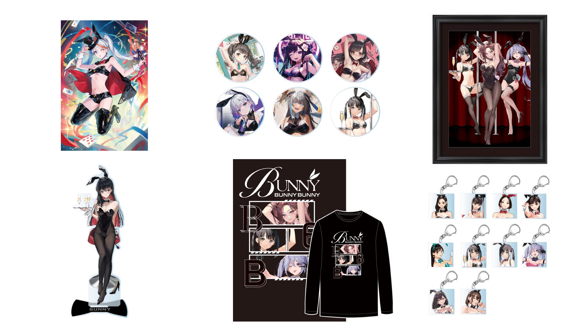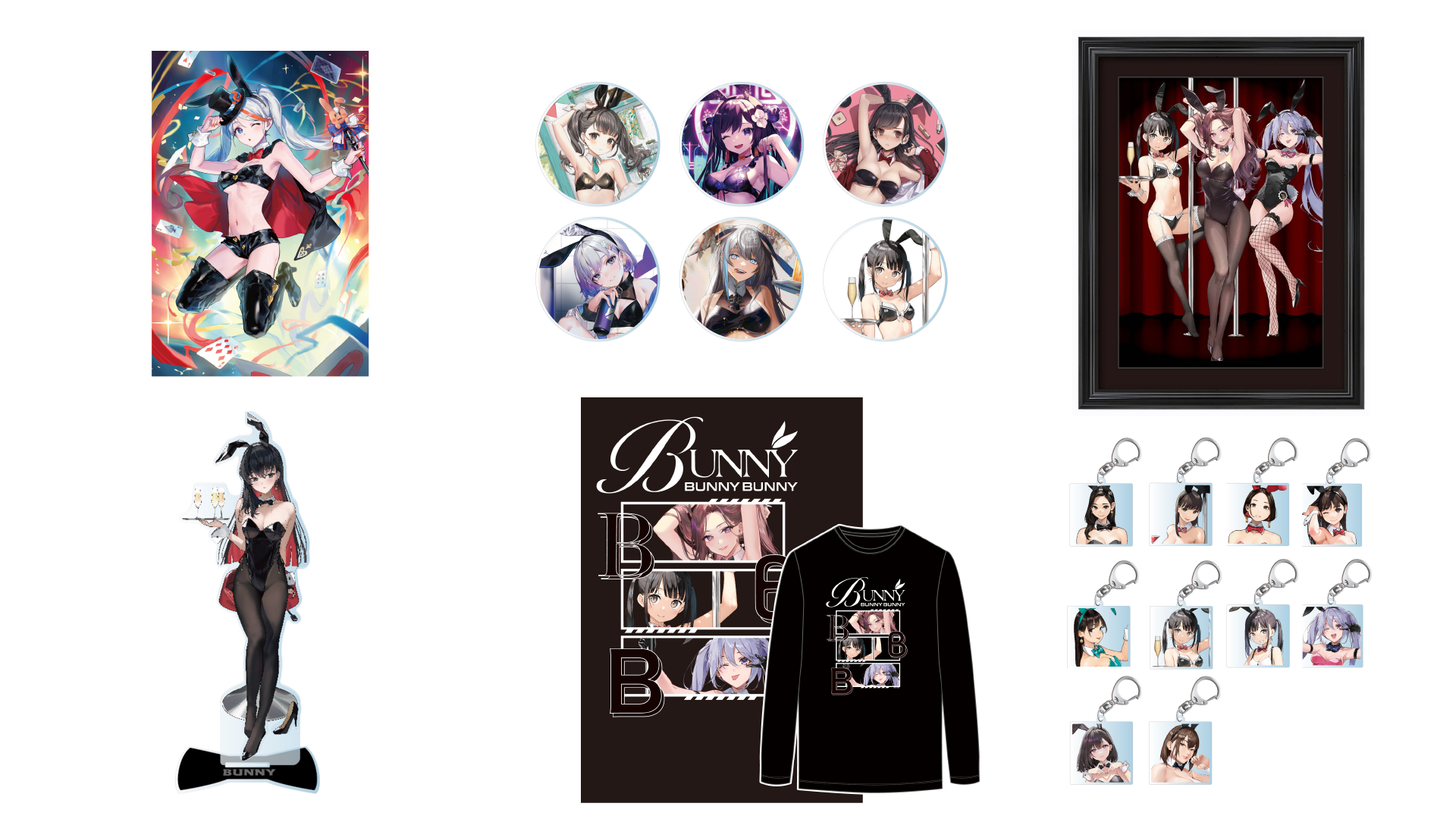 本展限定の販売商品として、過去のバニーシリーズを存分に味わえるキャンバスアートやステッカー、さらに本個展のために書き下ろしたイラストを使用したアイテムもご用意しています。