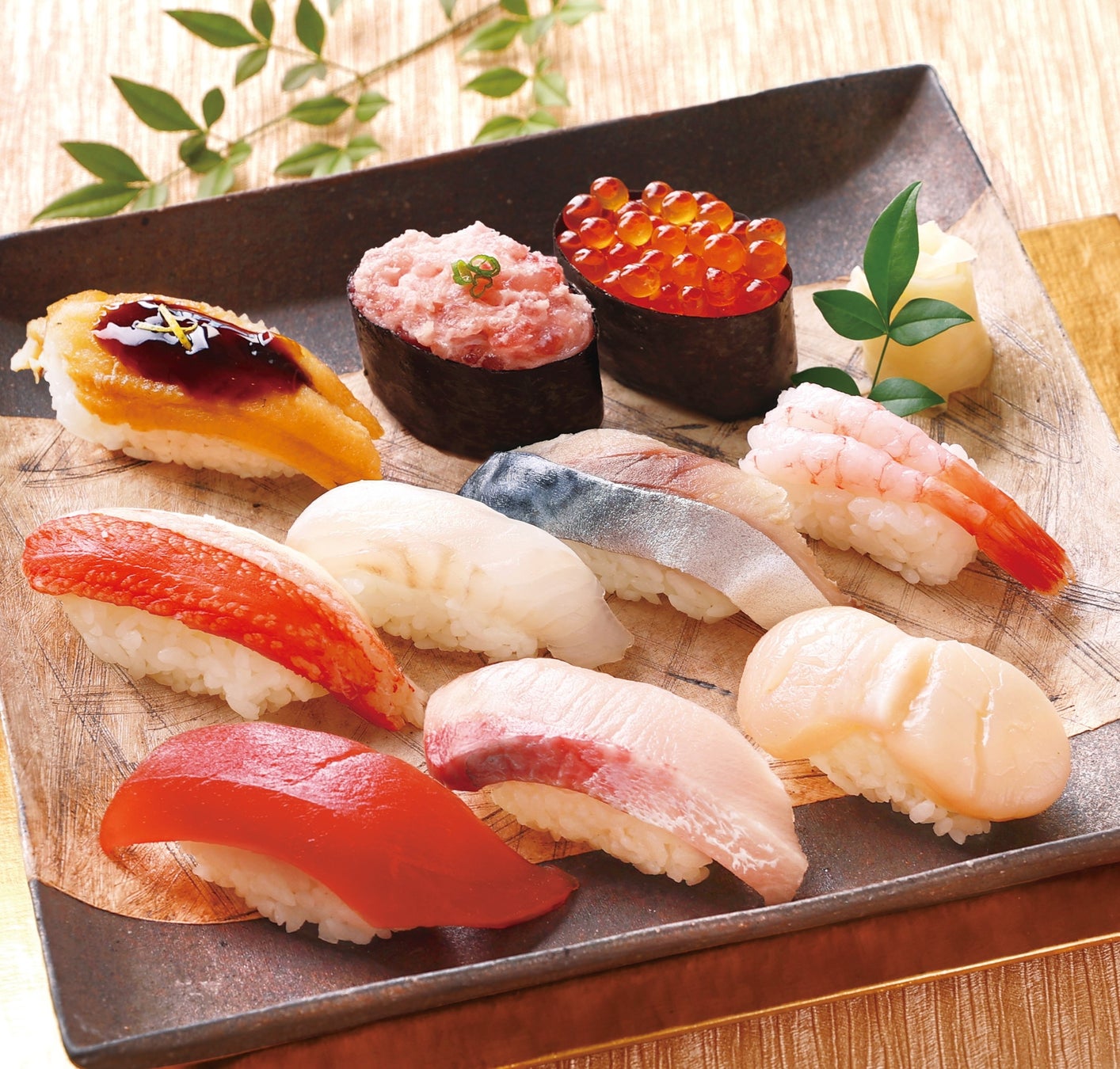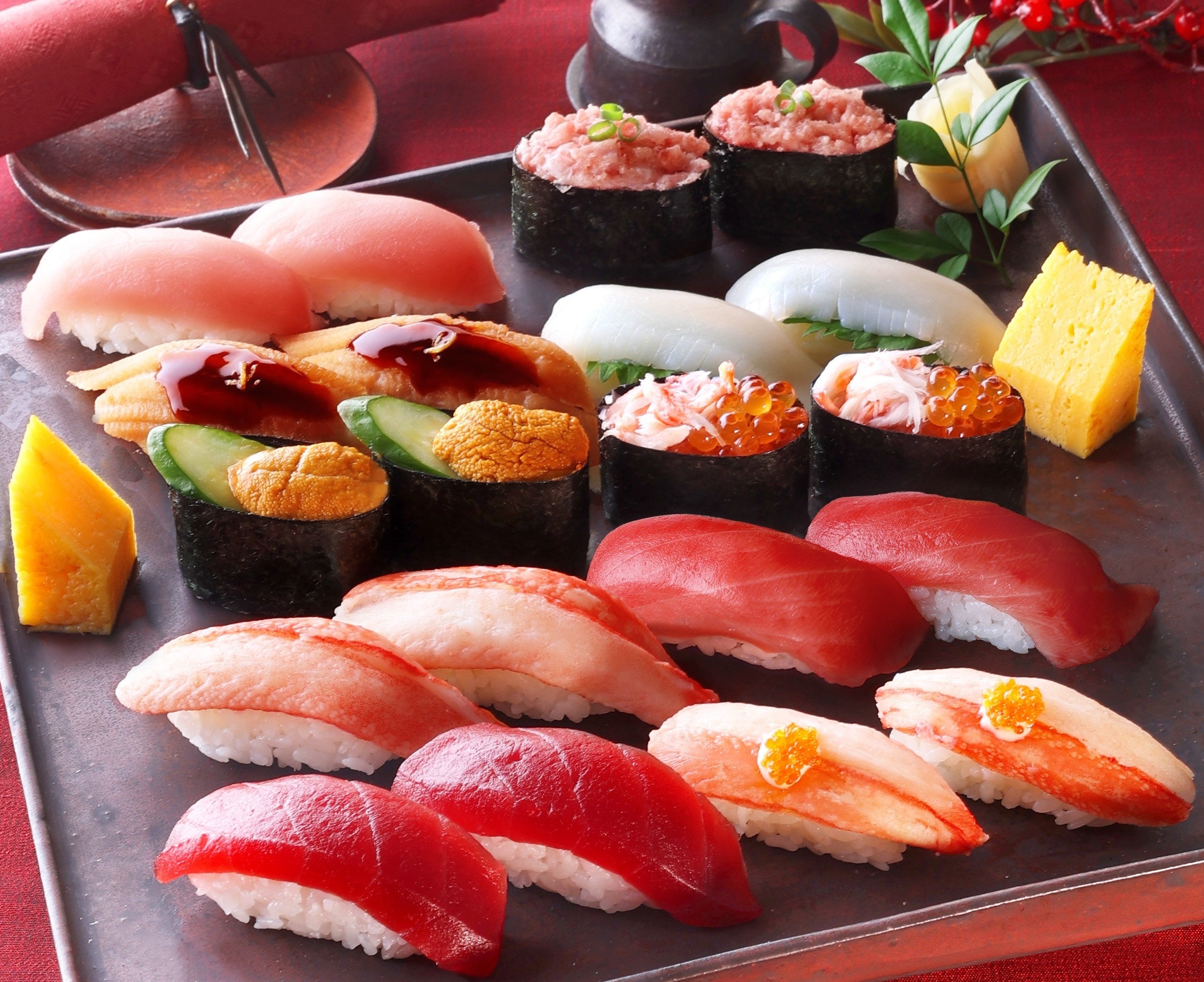 【商品内容】 ずわいがに、かにいくら軍艦、中とろ、まぐろ赤身、びんとろ、ねぎとろ、 柚子ふり穴子、生うに、いかしそ、かにとびっこ