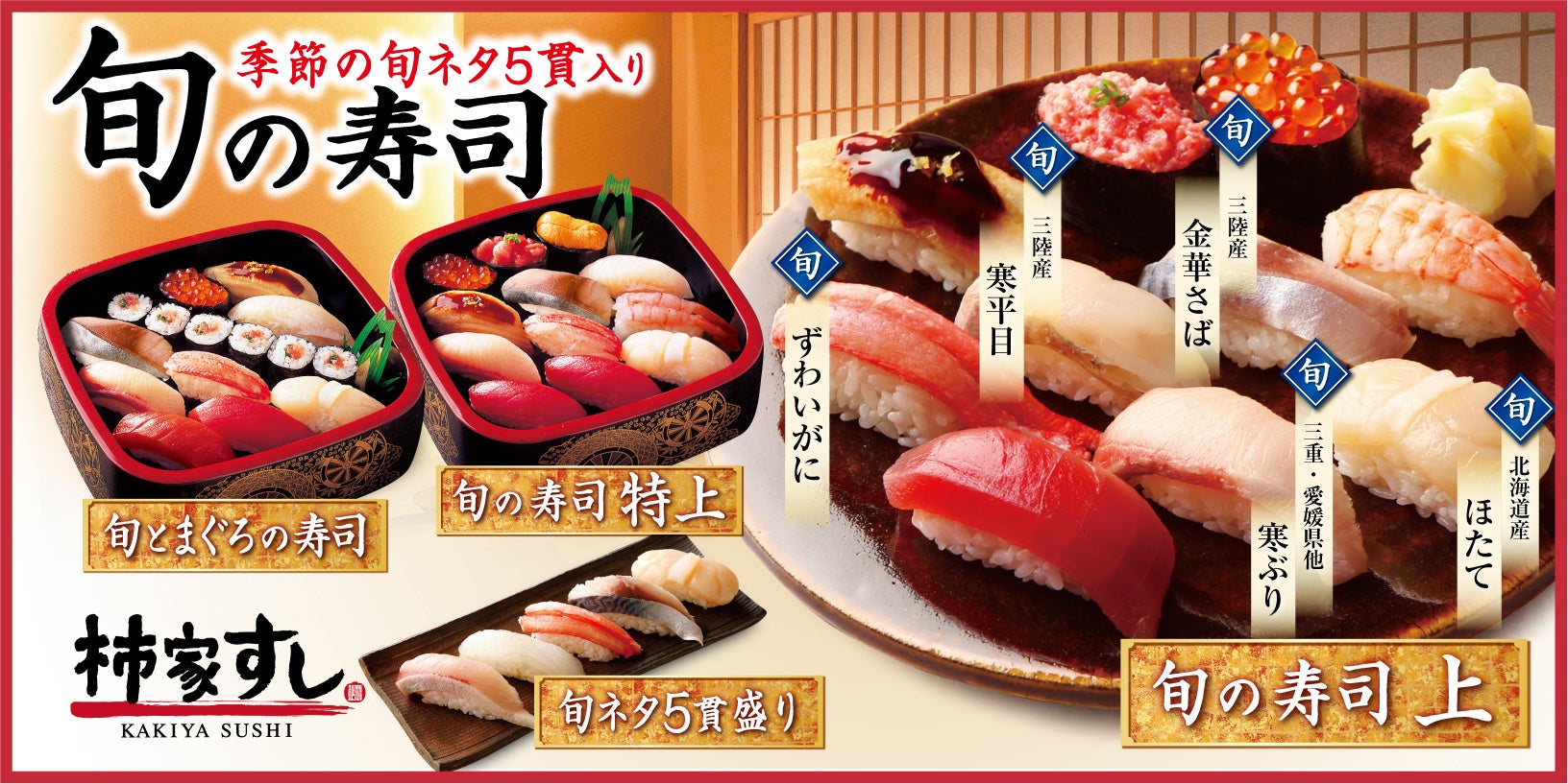 目利きのプロが全国の産地を訪ね歩き、その産地・その季節の美味しいネタを仕入れる「柿家すし」。季節に合わせて自信をもってお届けしている「旬の寿司」に、今年の冬に召し上がっていただきたい「ずわいがに」「金華さば」「寒ぶり」「ほたて」「寒平目」の5品を盛り込みました。
