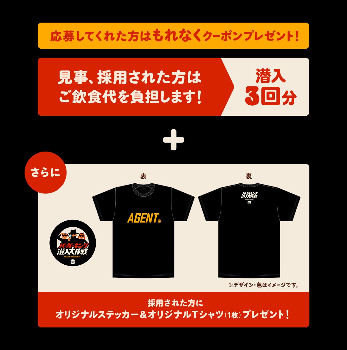 ②採用された方には、バーガーキング® 公認スパイの証である「オリジナルTシャツ」と「オリジナルステッカー」をプレゼントいたします。