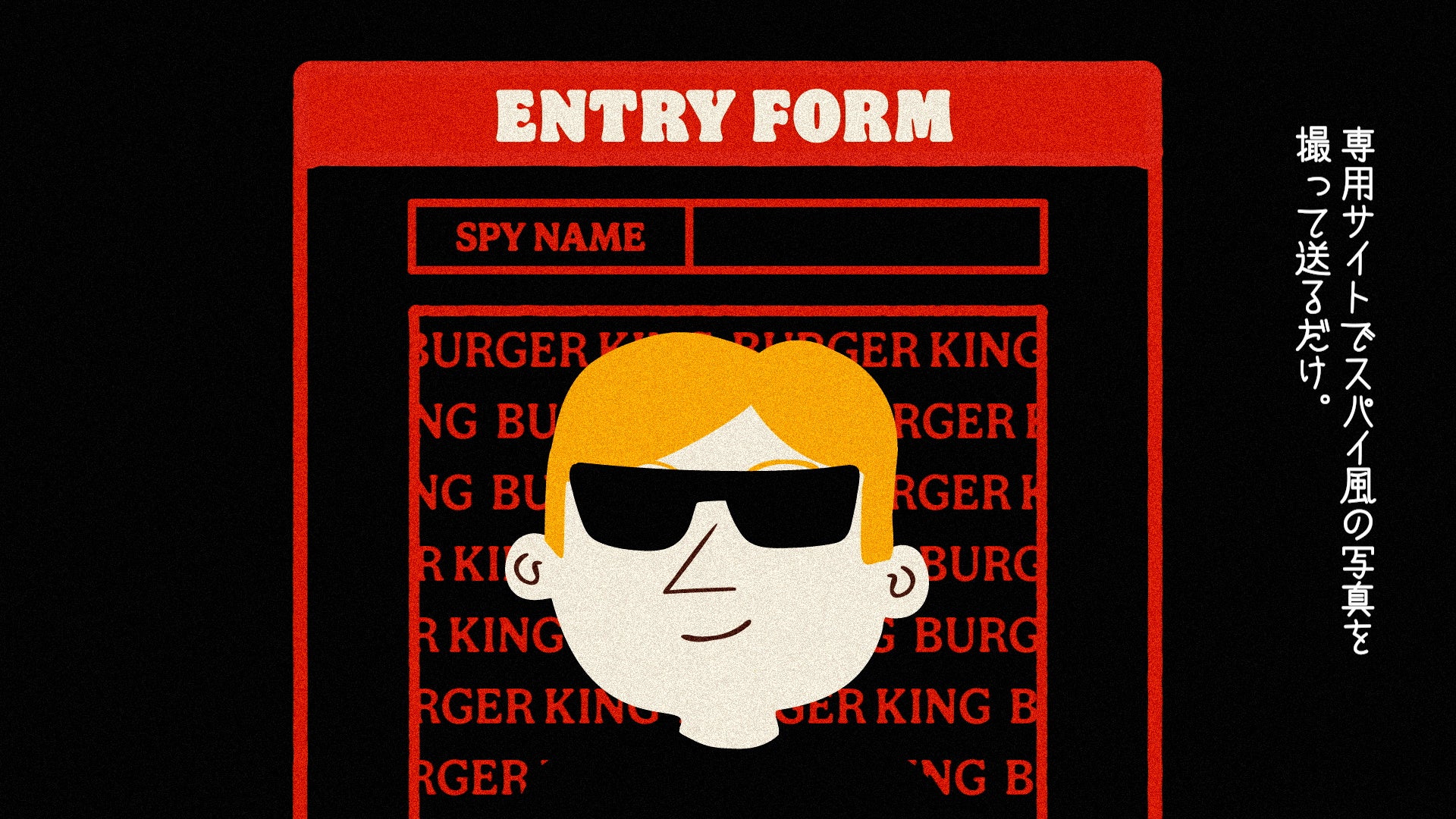 バーガーキング® をいつもご愛顧いただいているバーガーキング® ファンの皆様も、店舗に潜入するスパイに興味を持っていただける皆様も、ぜひ「バーガーキング® 潜入大作戦」 特設WEBサイトの応募フォームでスパイ風の写真を撮影の上、必要事項を記入しご応募いただけますようお願いいたします。