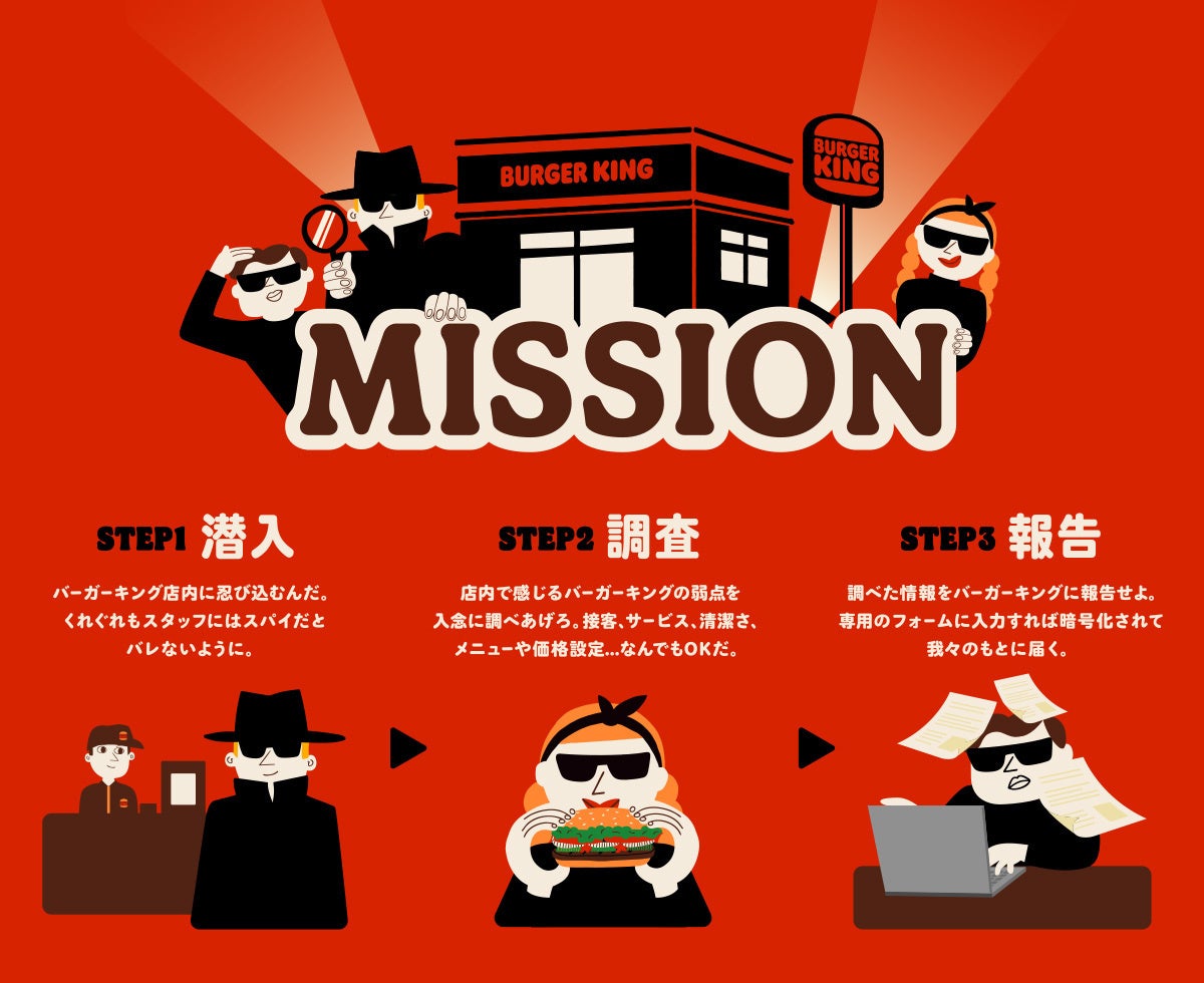 バーガーキング® では、店舗の急激な拡大に、接客、サービス、清潔さ、メニュー、価格設定など、すみずみにまで目が行き届いていない状況がございます。この課題をファンの皆様のお力をお借りしながら解決するべく、日本全国の皆様からバーガーキング® 店内に潜入して、接客、サービス、清潔さ、メニュー、価格設定など店舗の弱点をすみずみまで調査し、報告してくれる750名のスパイを募集する「バーガーキング® 潜入大作戦」を実施いたします。