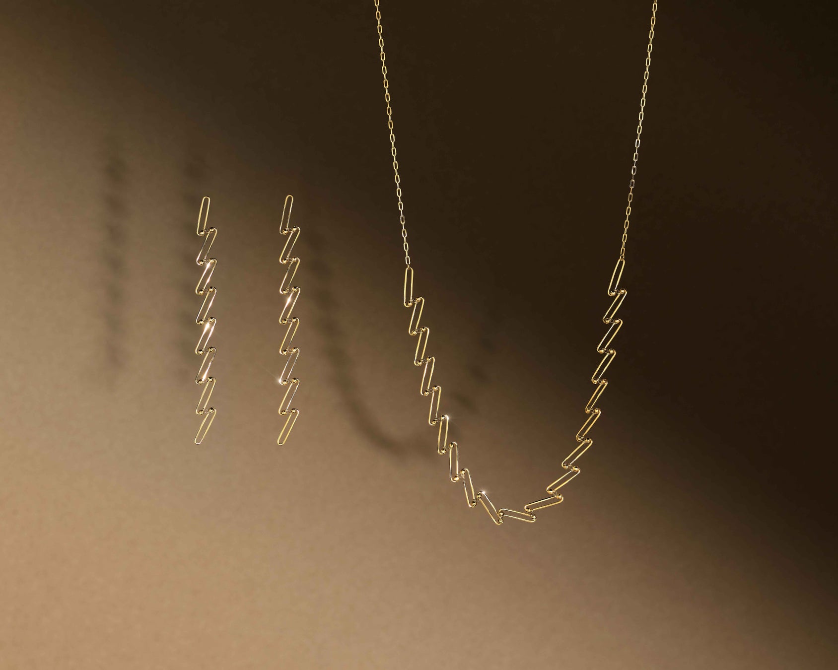 木の葉がスパイラル状に舞い上がる イメージからインスピレーションを得た、 グラフィカルなジュエリー。